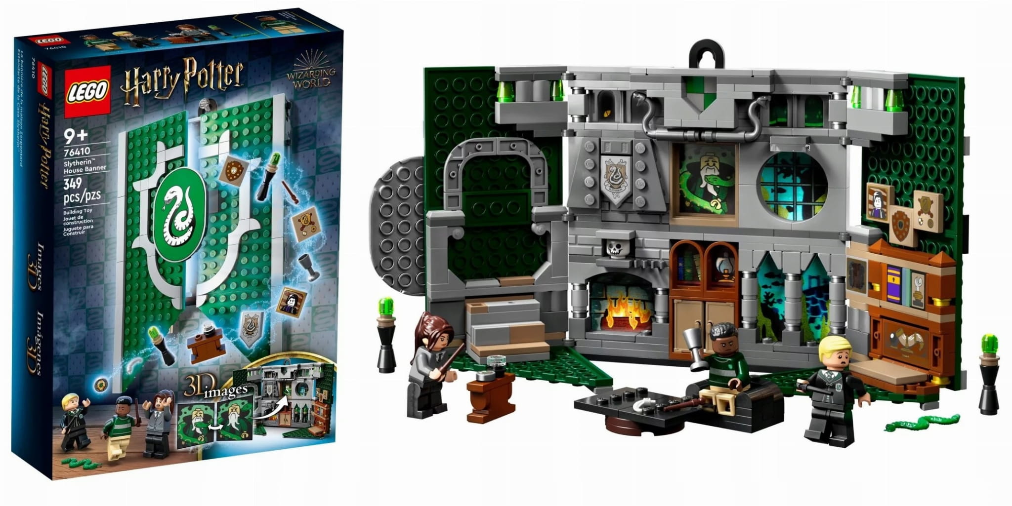 - LEGO® Harry Potter™ Flaga Slytherinu™ (76410) – ta flaga do zbudowania pozwoli dzieciom pokazać swoją wierność Slytherinowi. Zawieś ją lub otwórz, by bawić się w szczegółowym pokoju wspólnym