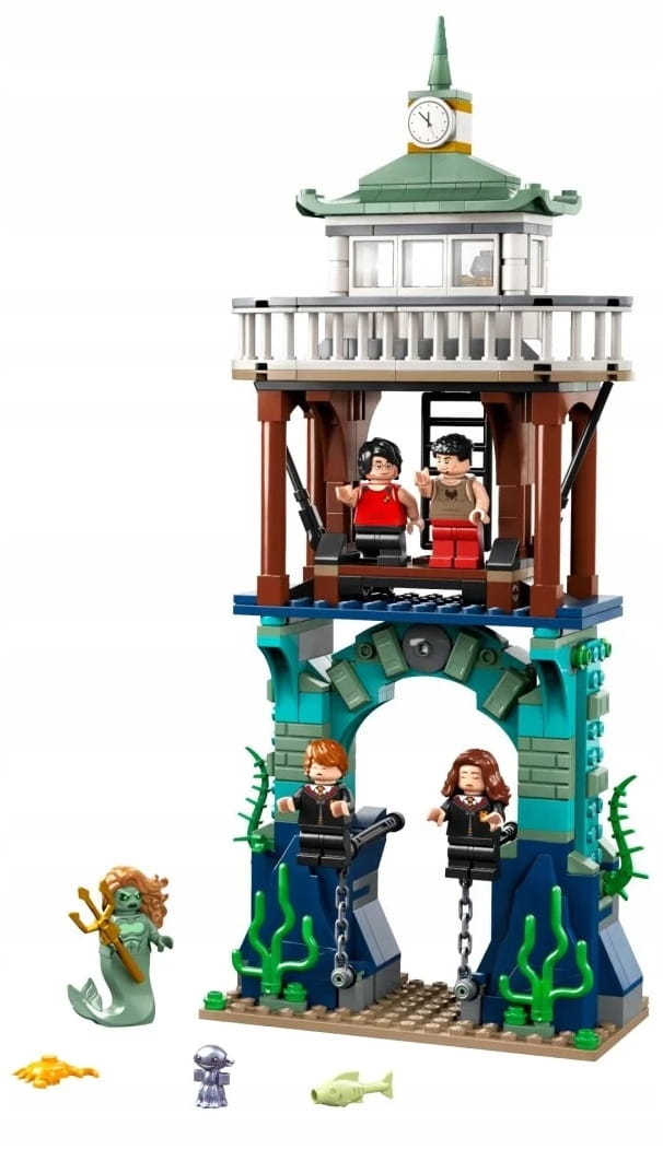 - Pięć minifigurek LEGO® i dwie figurki LEGO – Harry Potter™ z płetwami, Viktor Krum z głową rekina, Hermiona Granger™, Ron Weasley™ i syrena, a także figurki druzgotka i kraba