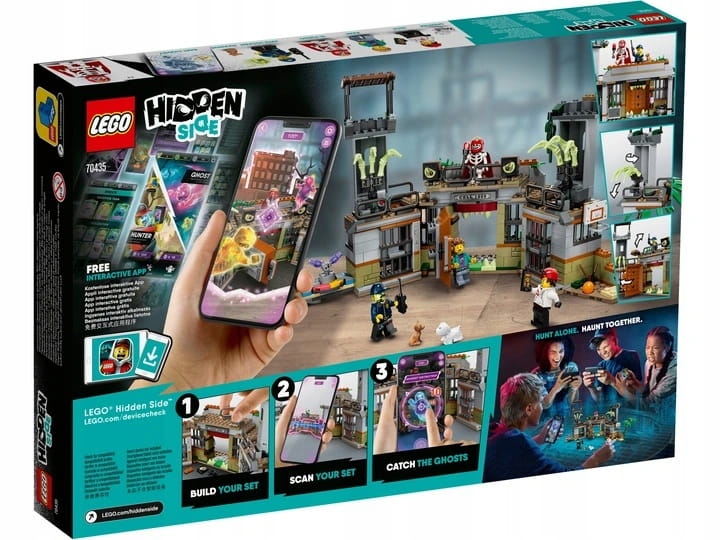 W świecie LEGO Hidden Side rzeczywistość cyfrowa i materialna przenikają się, tworząc rzeczywistość rozszerzoną i pozwalając dzieciom na zabawę w trybie dla jednego lub wielu graczy. Zestaw 70435 Opuszczone więzienie w Newbury pozwala połączyć kreatywną zabawę klockami LEGO z aplikacją do rzeczywistości rozszerzonej, więc interakcja z fizycznym modelem znajduje odbicie w cyfrowym świecie. Odjazdowa interaktywna zabawka konstrukcyjna dla dzieci Aby zobaczyć niezwykły cyfrowy świat, musisz tylko zeskanować model opuszczonego więzienia w Newbury urządzeniem z darmową aplikacją Hidden Side AR. Na ekranie zabawka ożyje i stanie się interaktywna. W tym świecie dzieci mogą odkrywać, polować na duchy, rozwiązywać zagadki i zmierzyć się z najpotężniejszym duchem, Bartem Chaneyem. Mogą też przerobić model na wersję nawiedzoną i bawić się nim jak zwykłymi klockami LEGO - pomogą w tym trzy minifigurki postaci i dwie figurki psów. Cyfrowa zabawa, która nieustannie ewoluuje Świat LEGO Hidden Side mieści się w fikcyjnym miasteczku Newbury, którego budynki i mieszkańców opanowały duchy. Aplikacja do rzeczywistości rozszerzonej jest stale wzbogacana o coraz to nową zawartość, duchy i wyjątkowe wydarzenia.