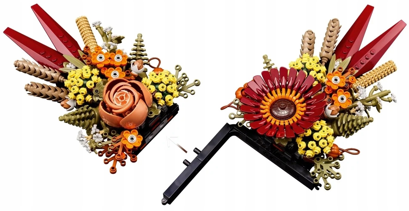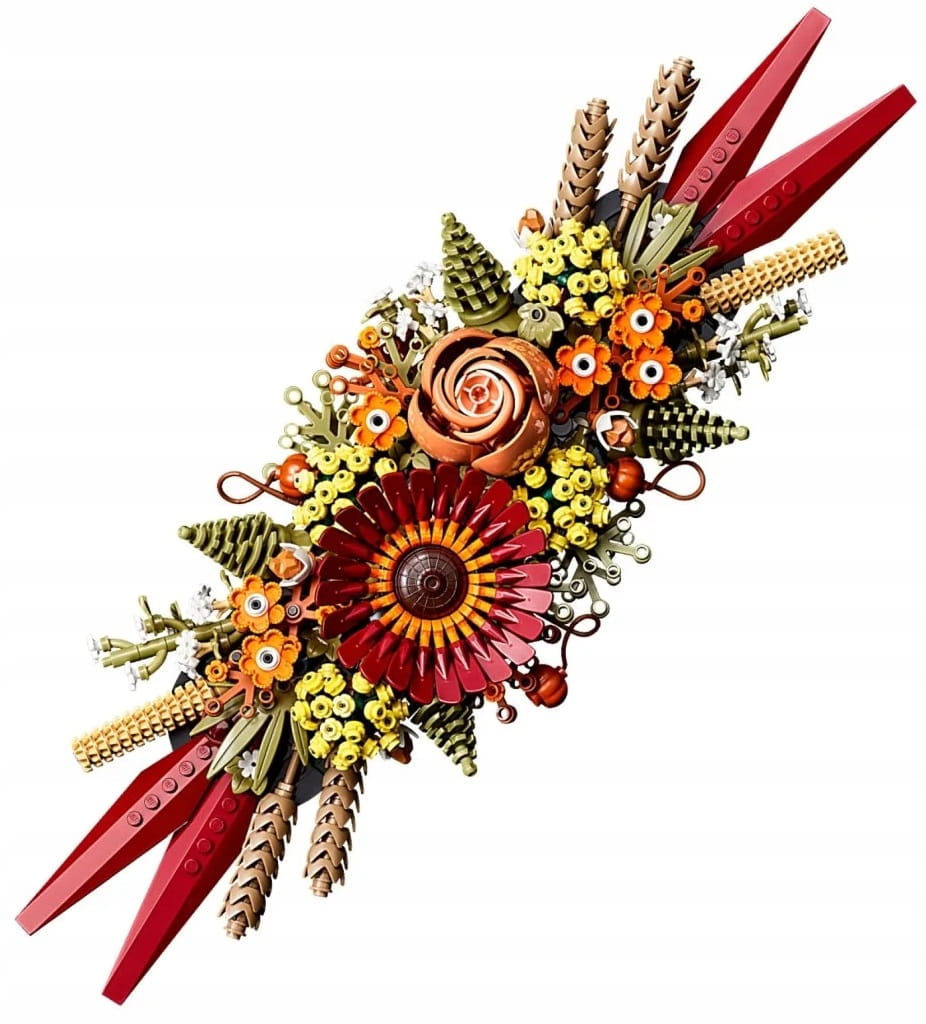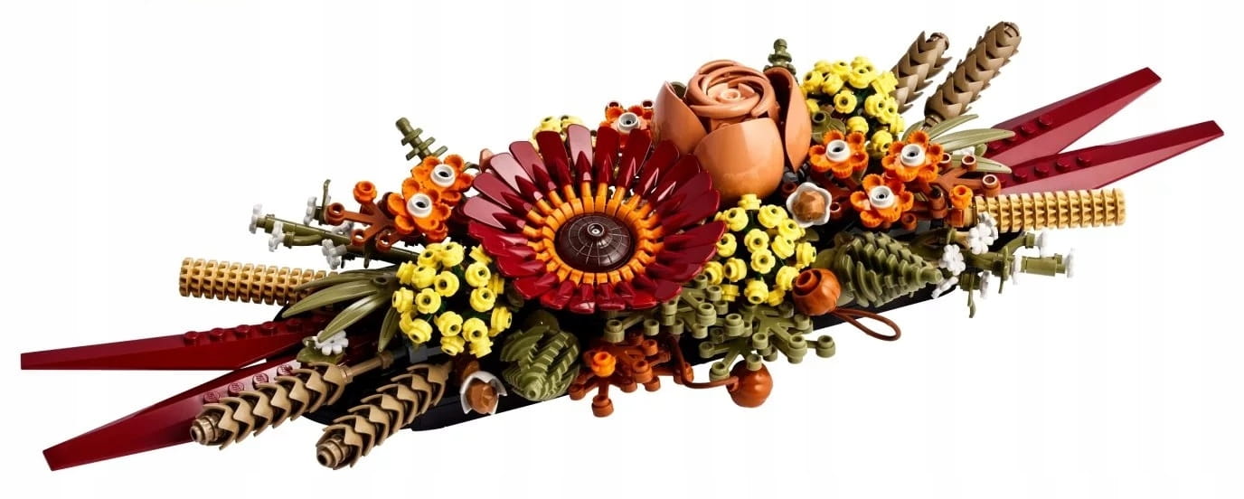 - Inspirowany jesienią – ten kwiatowy zestaw konstrukcyjny jest pełen kolorowych kwiatów inspirowanych barwami jesieni, a jego głównymi elementami są gerbera i róża