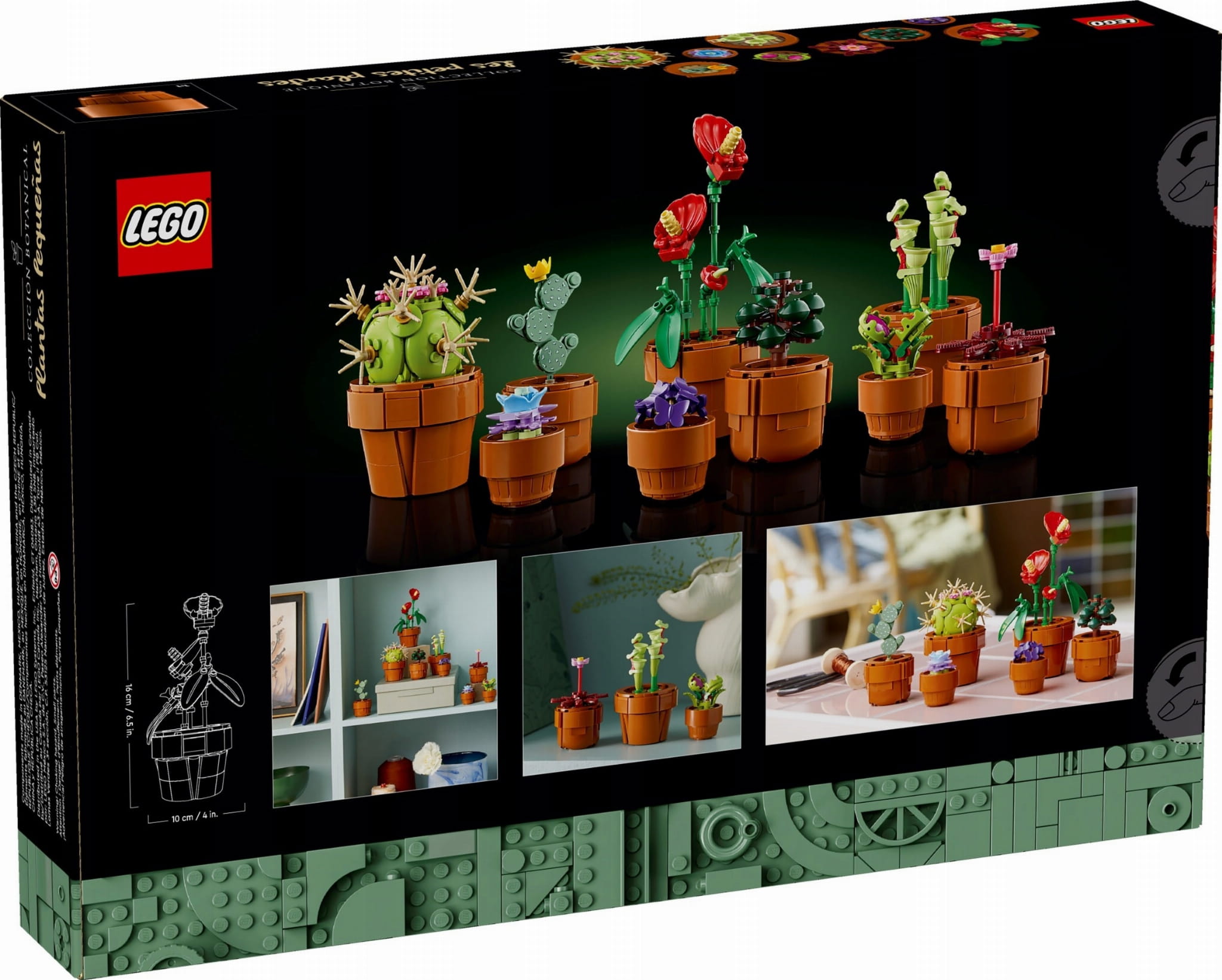 - Wymiary — najwyższa roślina w tym 758-elementowym zestawie (wraz z pojemnikiem) ma 16 cm wysokości, 10 cm szerokości i 6 cm głębokości