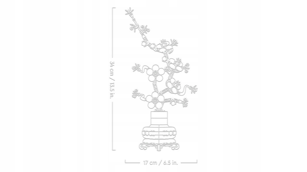 - Wymiary — kwiat śliwy z doniczką i cokołem w tym 327-elementowym zestawie ma 34 cm wysokości, 17 cm szerokości i 9 cm głębokości.