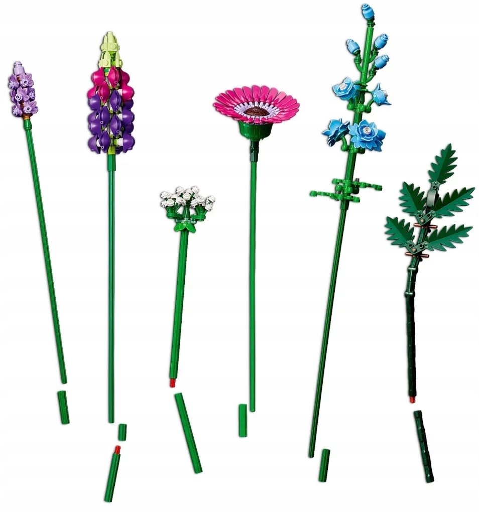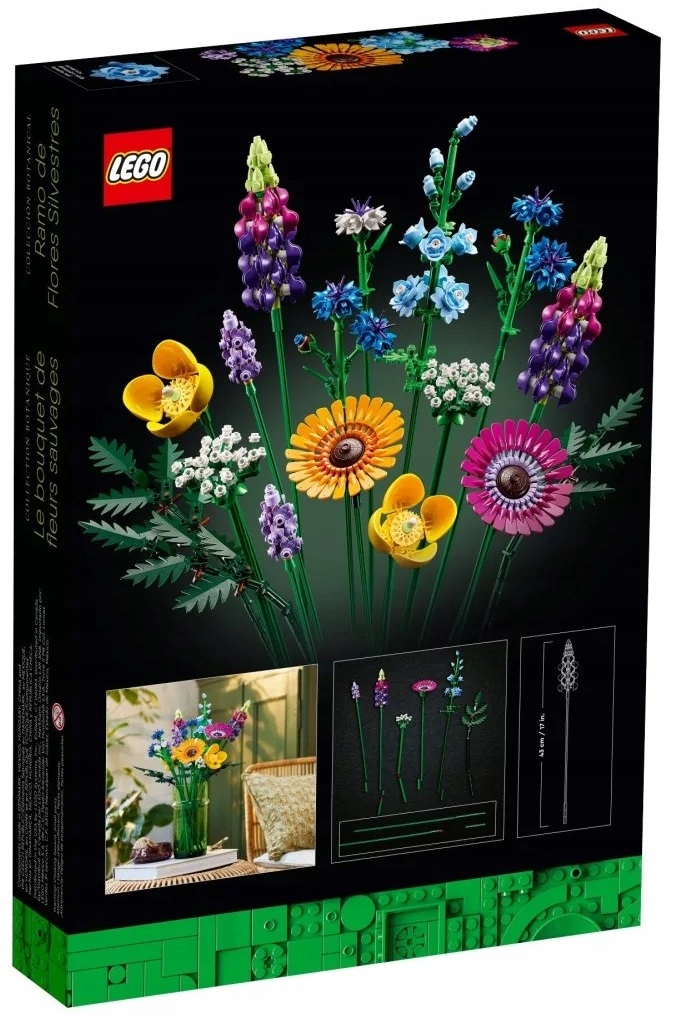 Złożony całkowicie ze szczegółowych klocków LEGO bukiet z polnych kwiatów obejmuje osiem gatunków kwiatów na regulowanych łodygach. Początkujący floryści i wielbiciele kwiatów mogą spędzić wiele godzin na budowaniu i odkrywaniu kwiatów inspirowanych chabrami, lawendą, makami walijskimi, trybulą leśną, paprocią skórzastą, gerberami, ostróżkami i łubinem.