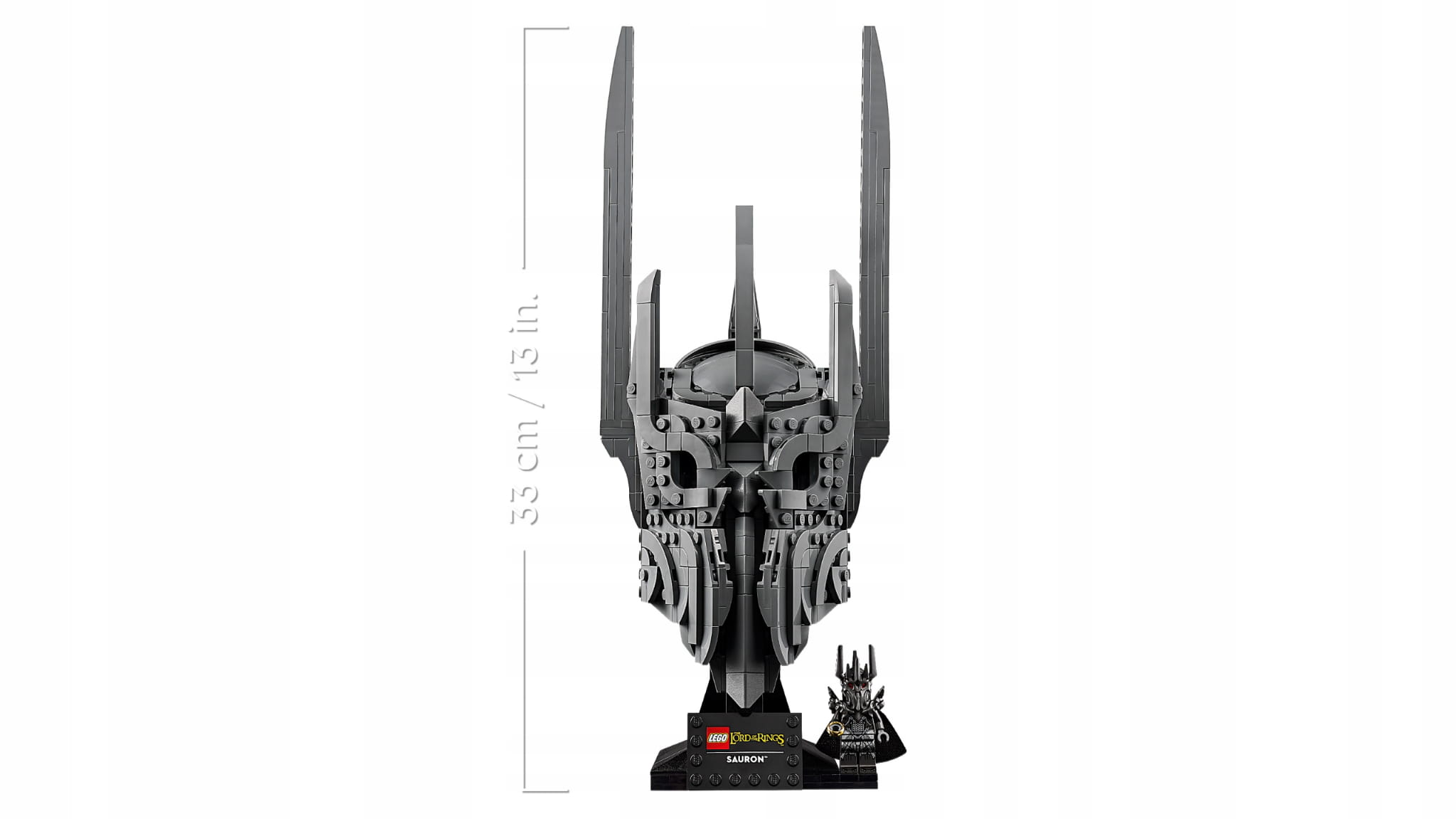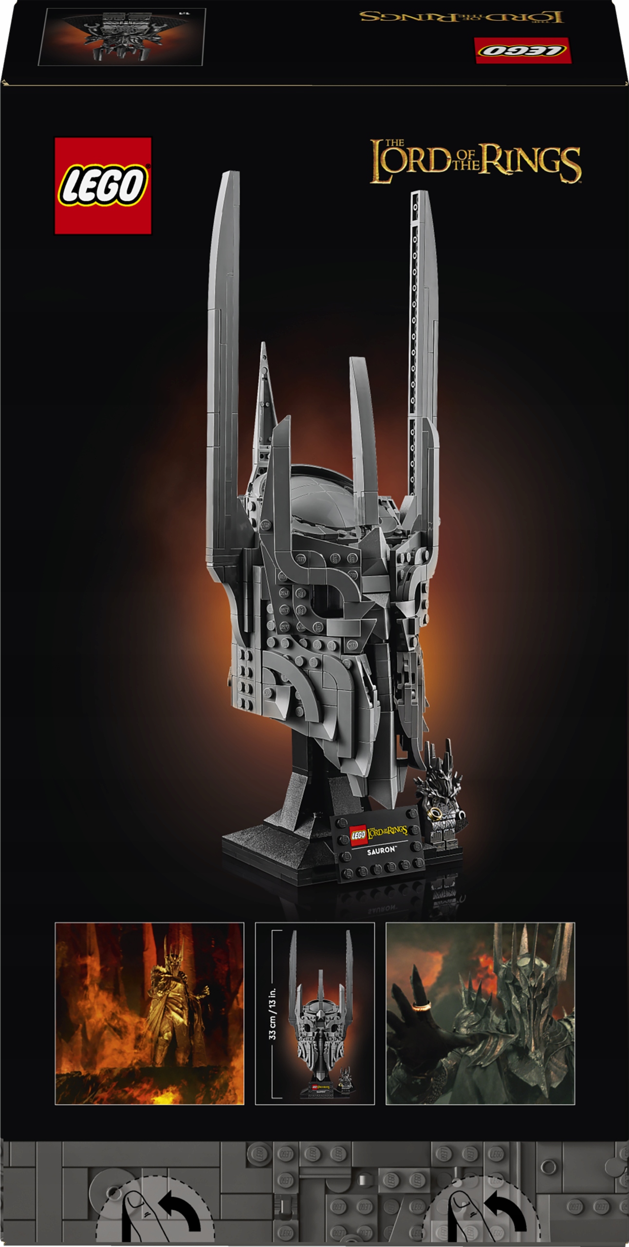 - Wymiary — model hełmu w tym 538-elementowym zestawie LEGO® Icons Władca pierścieni: Hełm Saurona ma 33 cm wysokości, 13 cm szerokości i 13 cm głębokości.