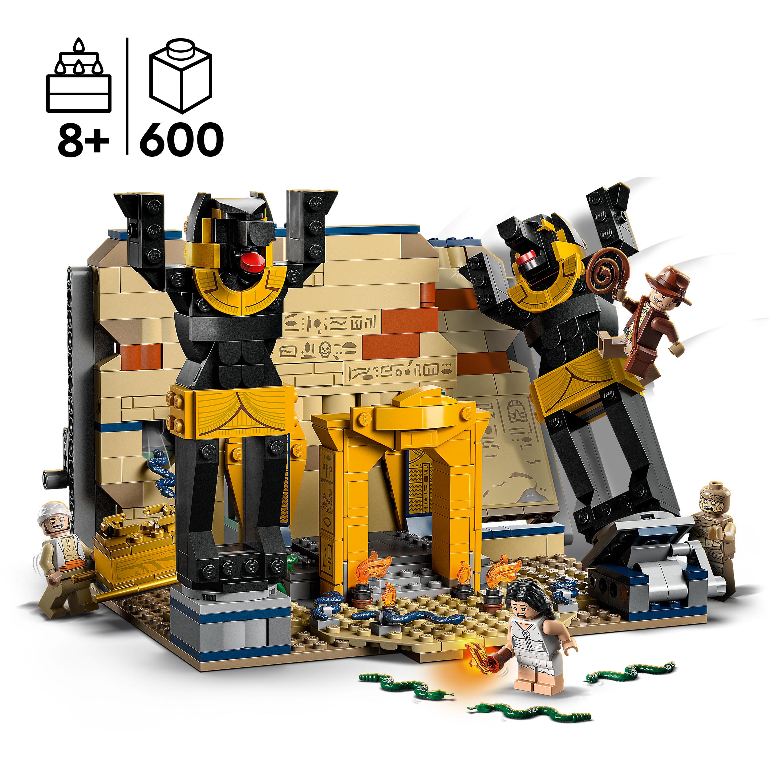 - Cztery minifigurki — Indiana Jones™ ze swoim słynnym kapeluszem i biczem, Marion Ravenwood™, Sallah™ i mumia. Jest też dużo węży: na podłodze i przechodzących przez ścianę