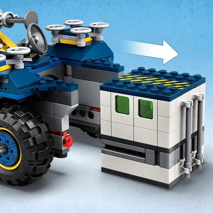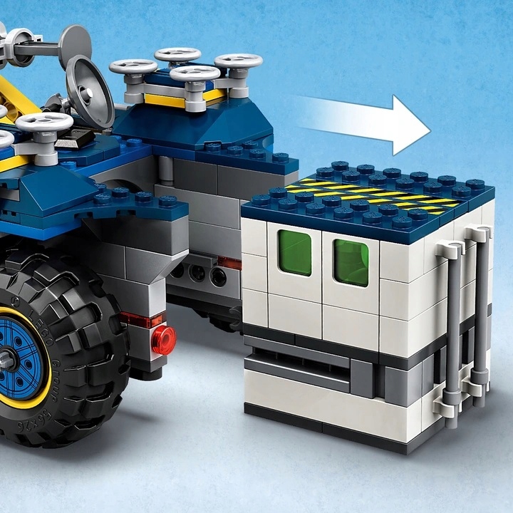 - Pojazd do zbudowania ma ok. 10 cm wysokości, 16 cm długości i 14 cm szerokości, a cały zestaw można połączyć z innymi zabawkami LEGO Jurassic World, żeby mieć jeszcze więcej możliwości wymyślania zabaw.