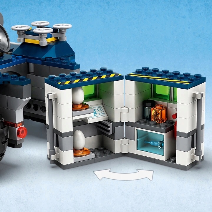 - Pojazd badawczy ma w kokpicie miejsce dla dwóch minifigurek, dwa odłączane drony, minilaboratorium, które można odczepić od pojazdu i rozłożyć oraz mnóstwo akcesoriów, takich jak dwa jaja dinozaurów, strzelba do usypiania, igła i pilot do dronów - w sam raz do wymyślania nowych historii.