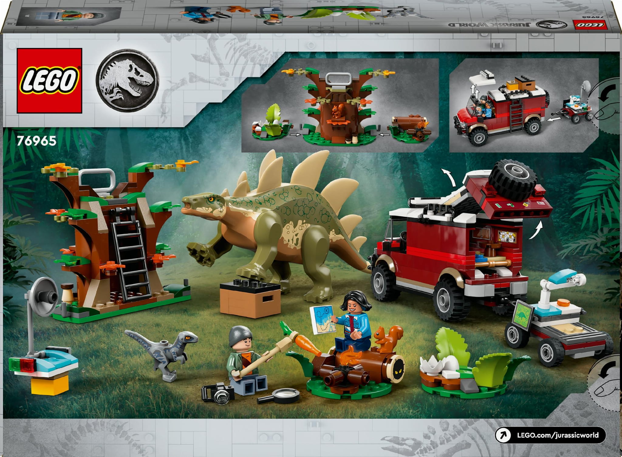 Po zbudowaniu zestawu LEGO® Jurassic World dzieci mogą wymyślać rozmaite historie, korzystając z figurki stegozaura z ruchomymi nogami, małej figurki welociraptora oraz minifigurek Bena i Sammy. W zestawie jest też drzewo z platformą obserwacyjną i dwiema odłączanymi sekcjami, a także terenówka z miejscem dla dwóch minifigurek, zdejmowanym dachem, otwieranym tyłem, ruchomą przestrzenią ładunkową i wieloma schowkami na akcesoria.