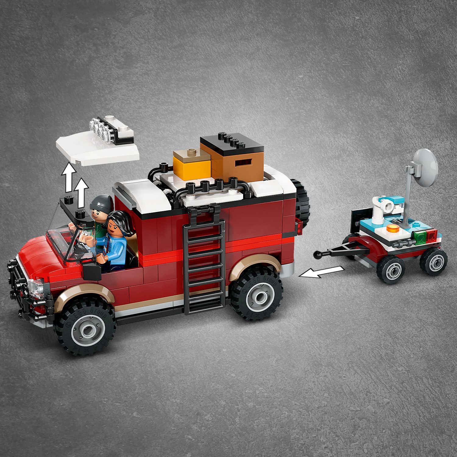 - Szczegóły historii — szczegółowy zestaw z Jurassic World zawiera drzewo z punktem obserwacyjnym i dwiema odłączanymi sekcjami, a także terenówkę z kabiną na dwie minifigurki, otwieranym tyłem i przyczepą