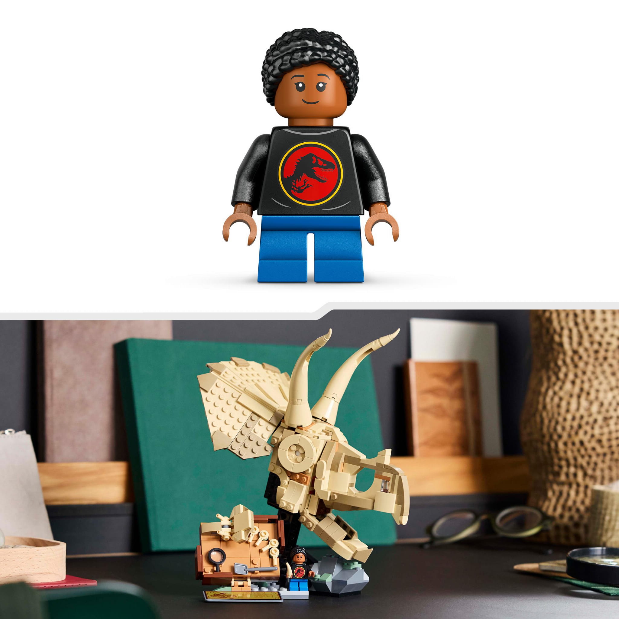 - Zestaw do budowaniadinozaura — zawiera czaszkę triceratopsa z podstawką, tabliczkę informacyjną, tabliczkę z miejscem wykopalisk z małymi skamieniałościami i narzędziami do wykopalisk, minifigurkę LEGO® młodego paleontologa i element „bursztynu”