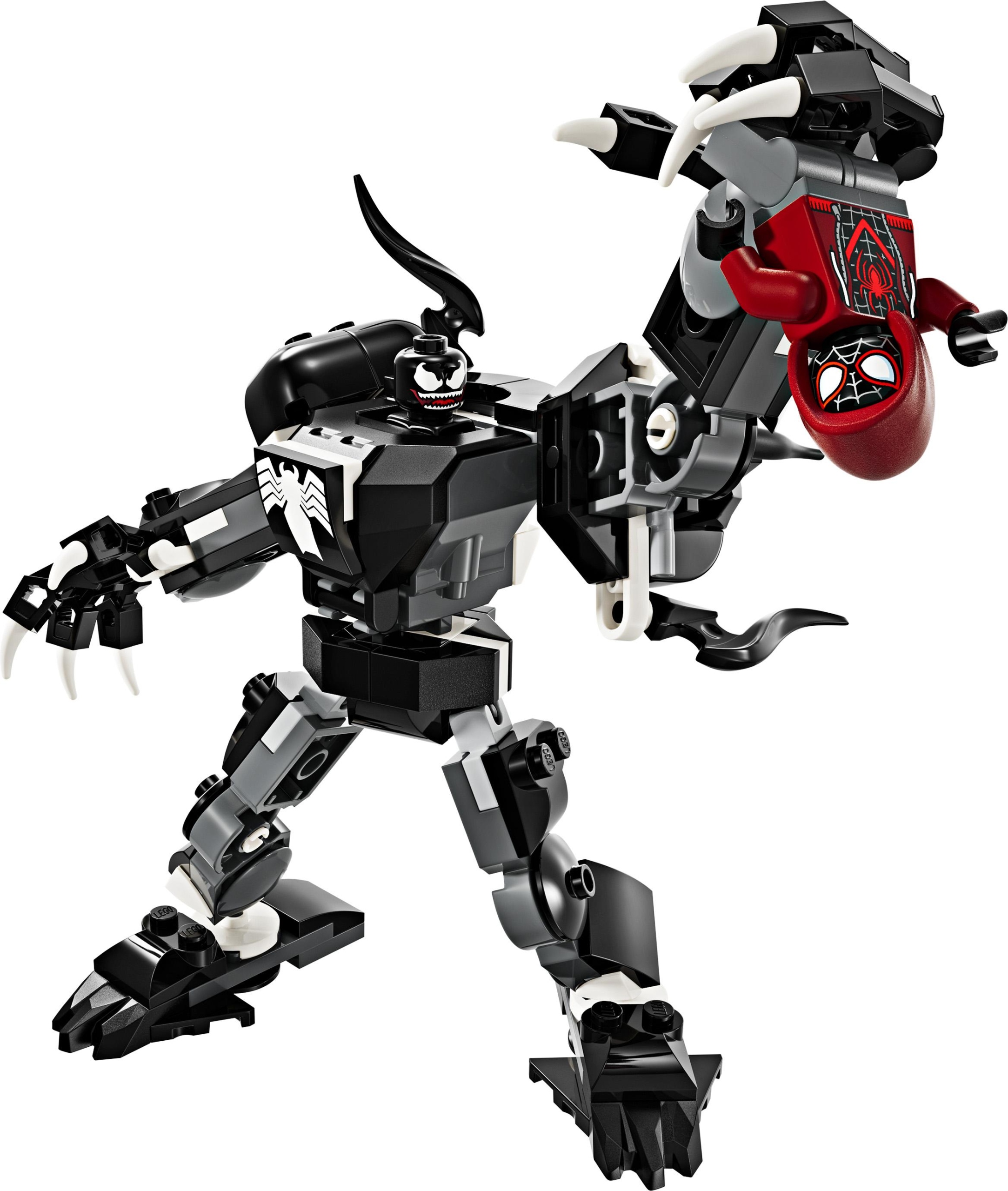 Jego korpus otwiera się, odsłaniając kokpit dla minifigurki Venoma. Zestaw zawiera także minifigurkę Milesa Moralesa z dwoma ręcznymi miotaczami sieci i elastyczną sieciową „liną”, którą można przyczepić w wielu punktach na mechu Venoma. Na dzieci czeka jeszcze więcej zabawy, jeśli połączą ten zestaw z innymi mechami LEGO Marvel z tej serii (sprzedawanymi osobno).