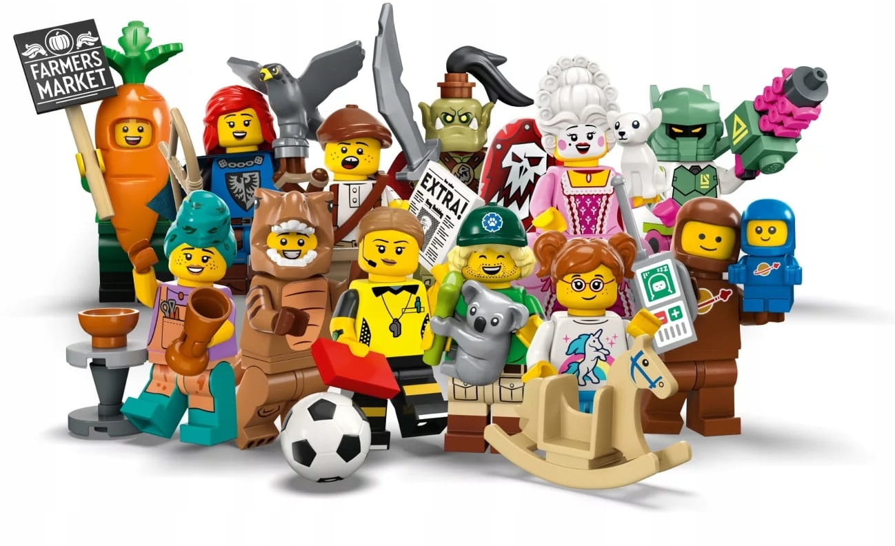 Dzieci i dorośli kolekcjonerzy będą zachwyceni tym zestawem minifigurek LEGO, w którym znajdują się: miłośnik tyranozaurów w przebraniu, arystokratka z epoki rokoko, robot-wojownik, dzieciak roznoszący gazety, garncarz, ork, sędzia piłkarski, sokolniczka, ekolog, marchewka – maskotka, brązowy astronauta i kosmiczne dziecko oraz dziewczyna na koniu na biegunach.
