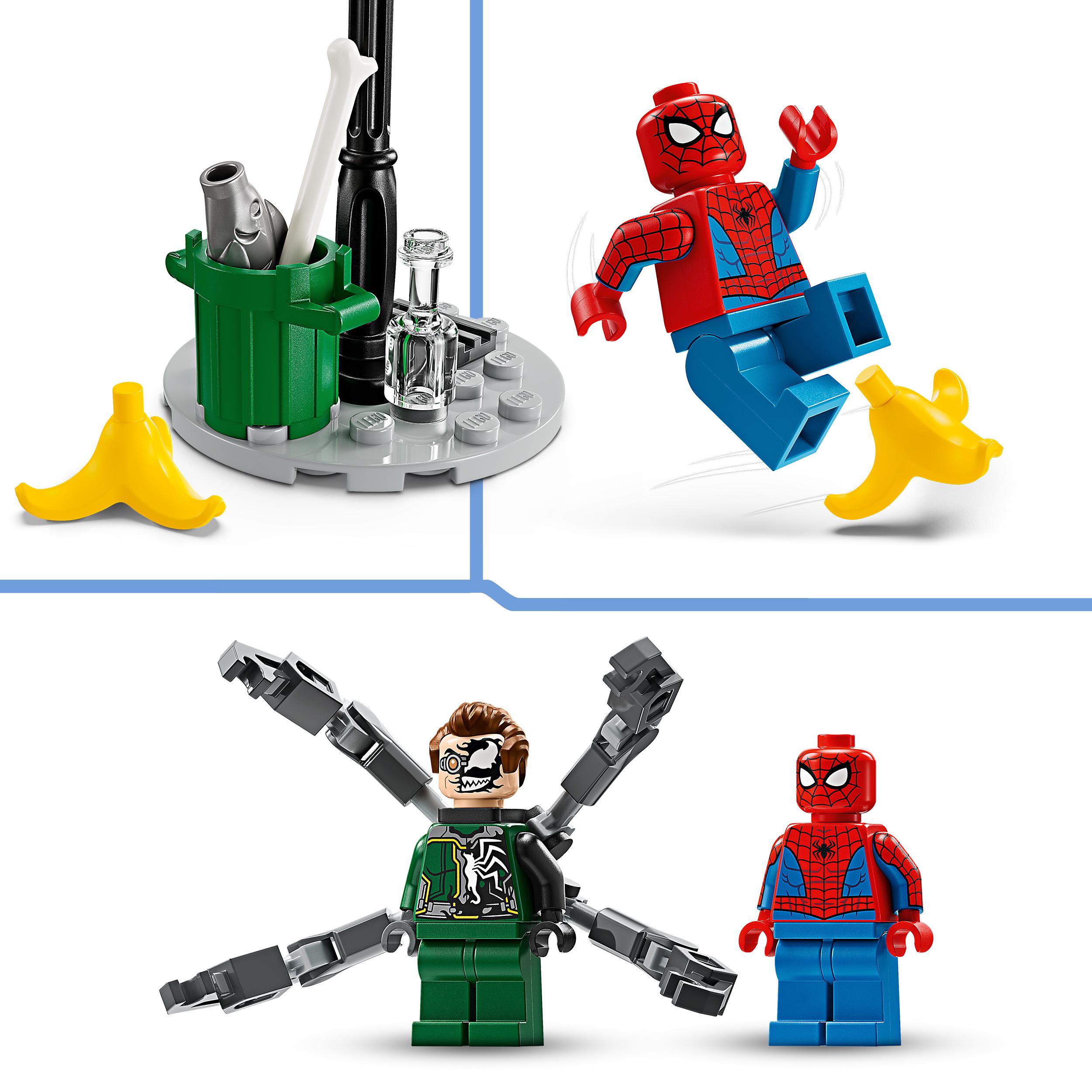 Minifigurki mogą chwytać się innych elementów, w tym latarni ulicznej, dynamitu i kosza na śmieci zawierającego butelkę, rybę, kość i skórkę banana. Motocykl Spider-Mana oraz miotacze klocków i sieci dodają dynamizmu zabawie.