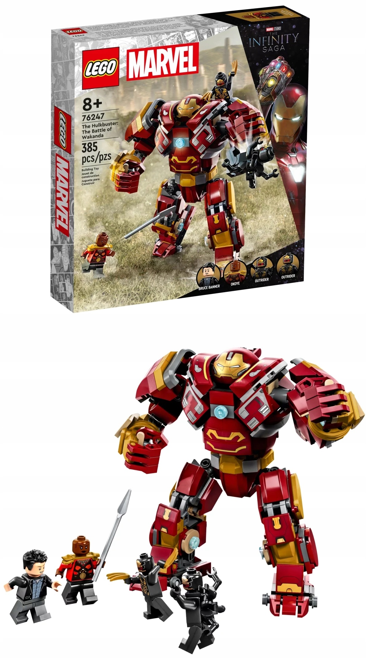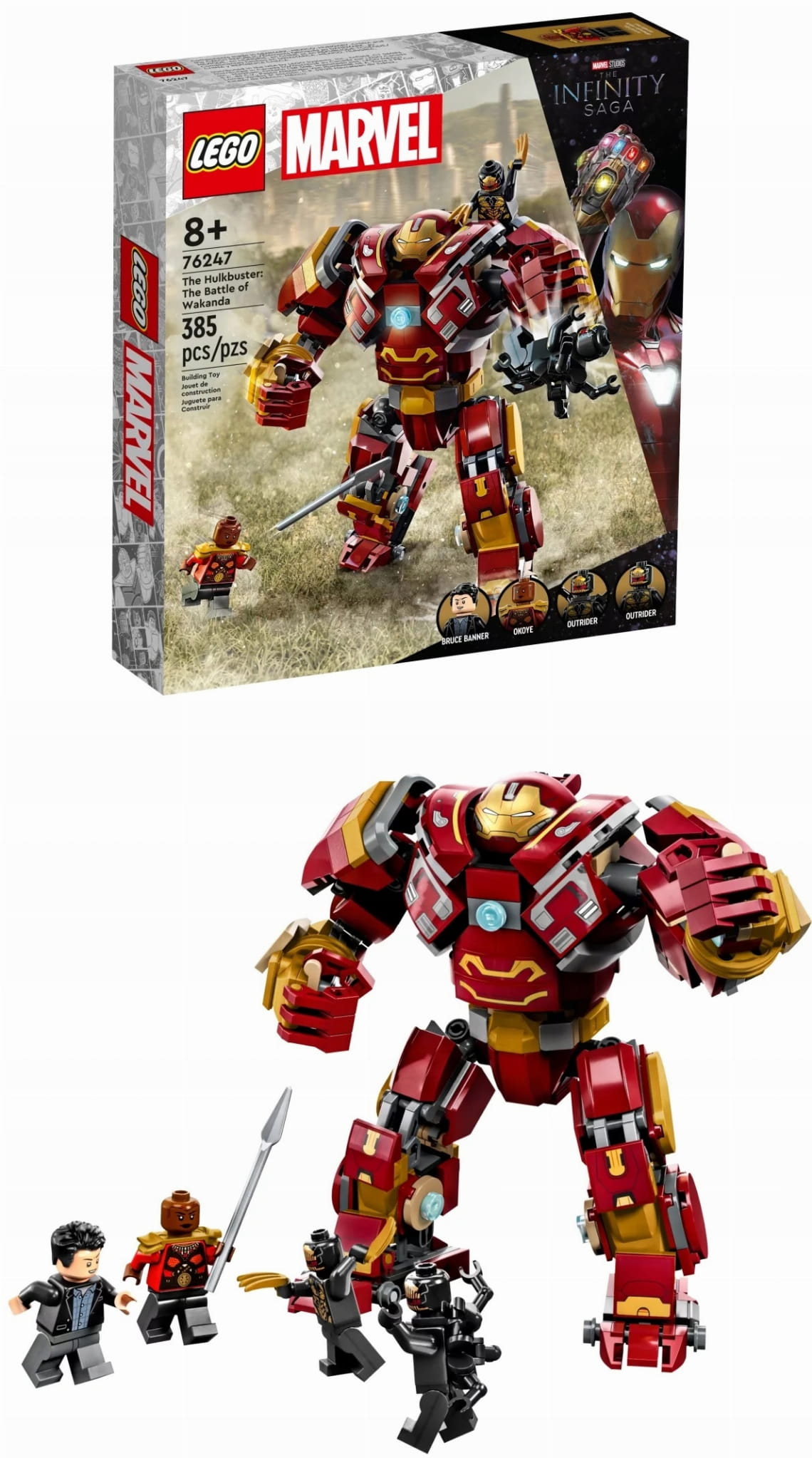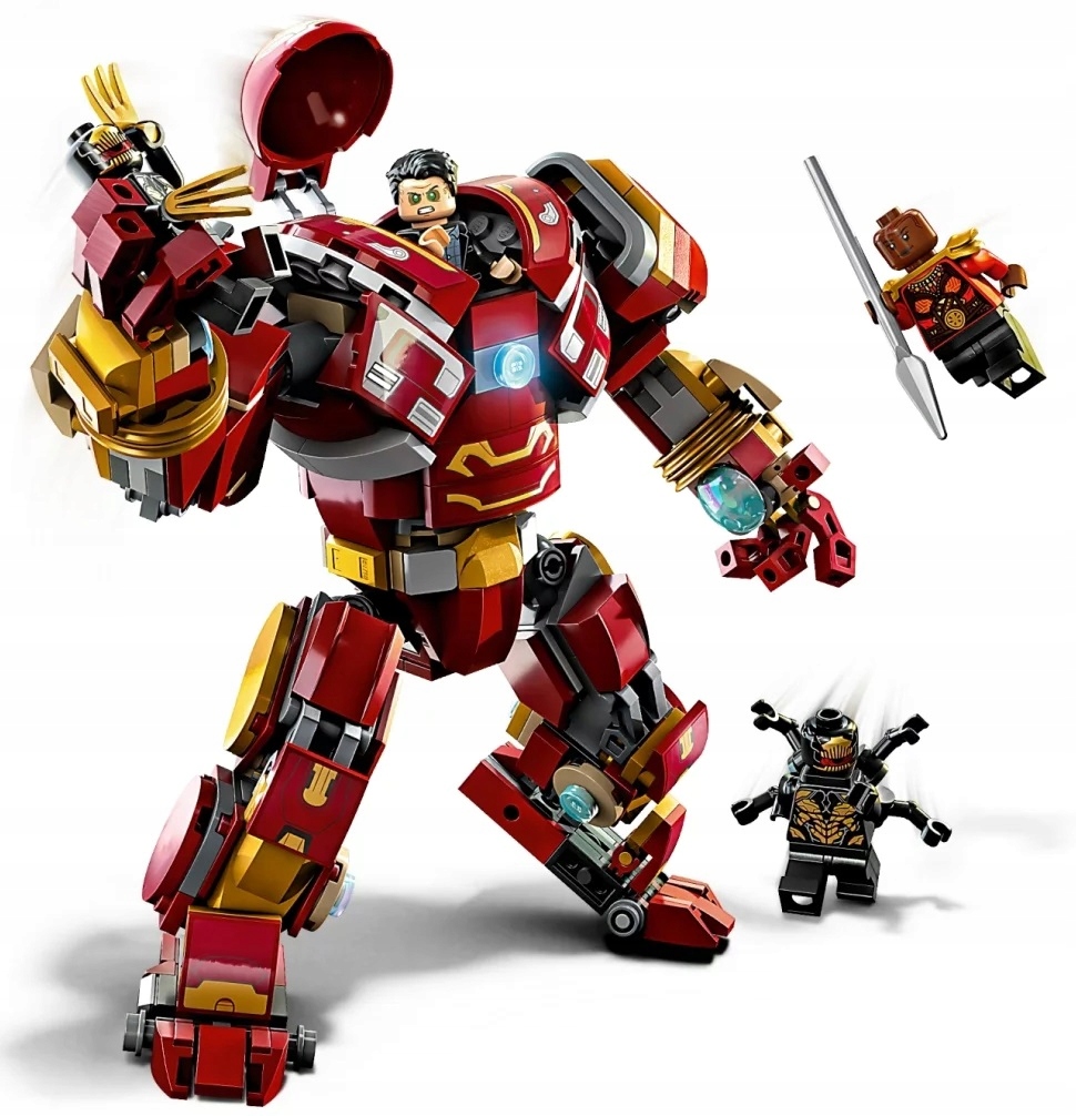 Inspirowany sceną z filmu Marvel Studios „Avengers: Wojna bez granic” zestaw zawiera mega kombinezon Hulkbustera do zbudowania z wieloma punktami zgięć, więc dzieci mogą z łatwością poruszać mechem i ustawiać go w różnych pozach. Blokowane stawy kolanowe zapewniają wyśmienitą stabilność, a otwierany kokpit odsłania miejsce na minifigurke pilota. W komplecie są cztery minifigurki: Bruce Banner, Okoye i dwóch pomocników. Głowa Bruce’a Bannera obraca się, by pokazać, jak zmienia się w zielonego Hulka. Okoye trzyma włócznię.