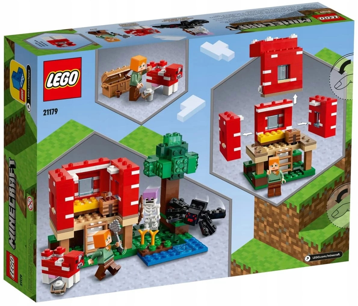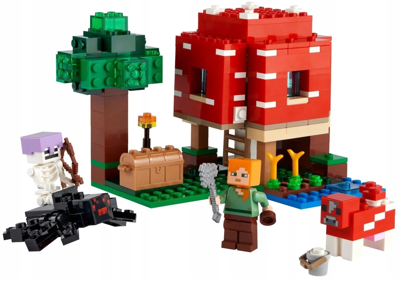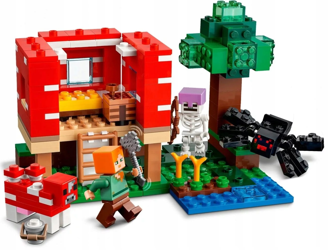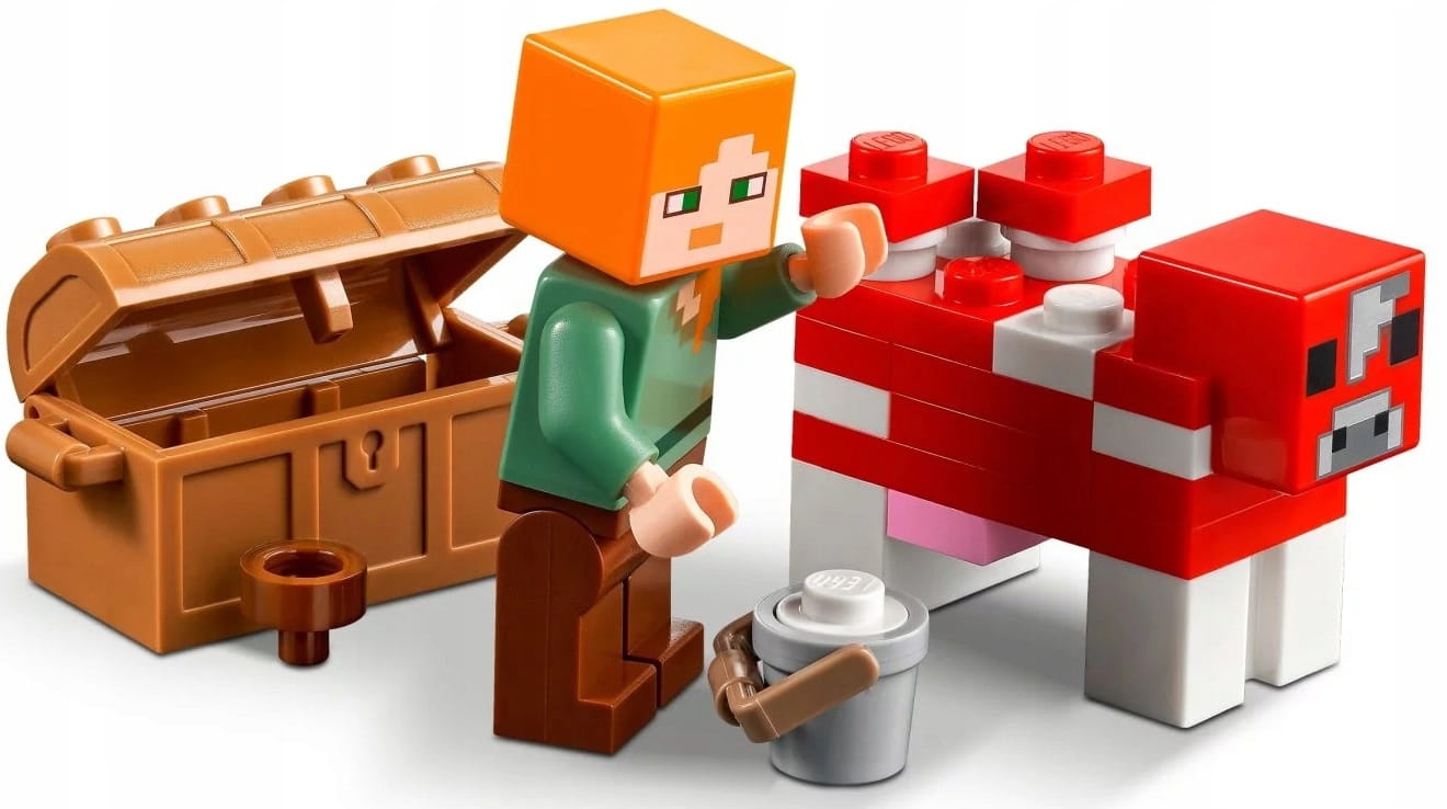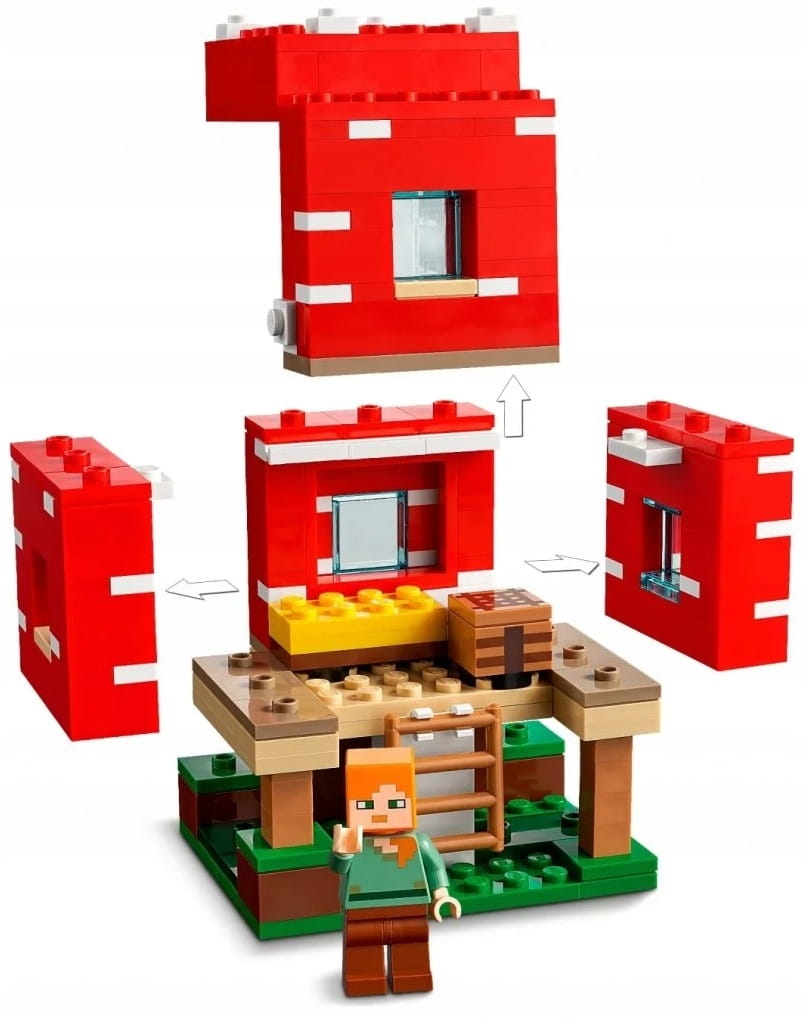 Ogromny dom w grzybie to dla graczy w Minecrafta okazja do kreatywnej zabawy klockami. Dach i ściany konstrukcji można podnieść, by dostać się do mebli i stołu rzemieślniczego. Na zewnątrz bohaterka gry Minecraft Alex może wydoić grzybową krowę, by zebrać zupę do miski. Zmienia jednak plany, gdy zauważa zbliżającegosię pajęczego jeźdźca. Możliwości pobudzającej wyobraźnię zabawy są w tym domku z Minecrafta niemal nieograniczone.