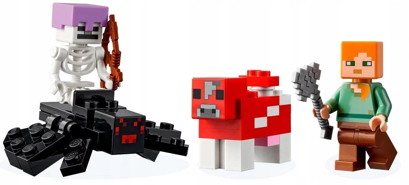 - Realistyczne detale — zestaw zawiera znane postacie z Minecrafta®: Alex, grzybową krowę i pajęczego jeźdźca, a do tego sporo ciekawych funkcji i interesujących akcesoriów z gry
