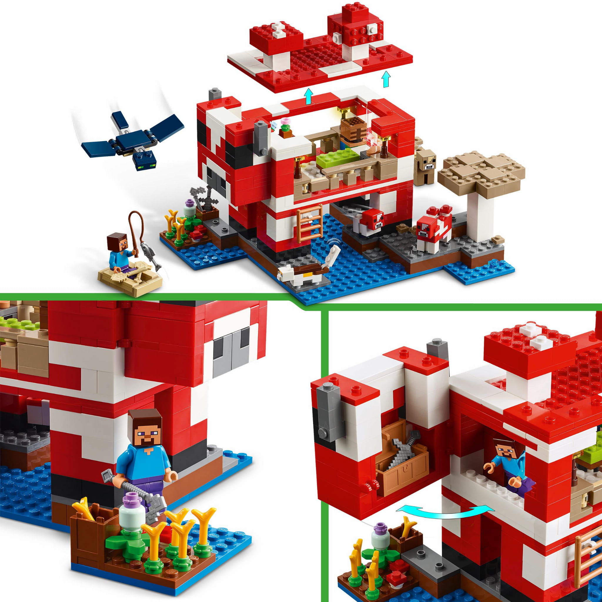 Zestaw LEGO Minecraft jest osadzony na grzybowej wyspie i zawiera znanego bohatera, Steve'a, a także czerwoną grzybową krowę, małą czerwoną grzybową krowę, brązową grzybową krowę, trójkolorowego kota i wrogiego fruwającego fantoma. Zestaw zawiera mnóstwo elementów z gry, w tym małą farmę z pszenicą, grzybami i dzbanecznikiem obok kompostownika. Akcesoria obejmują wędkę, dorsza, motykę, netherytowy miecz, miskę, łódź z wiosłami, skrzynię, piec, stół rzemieślniczy, regał, chleb i łóżko.