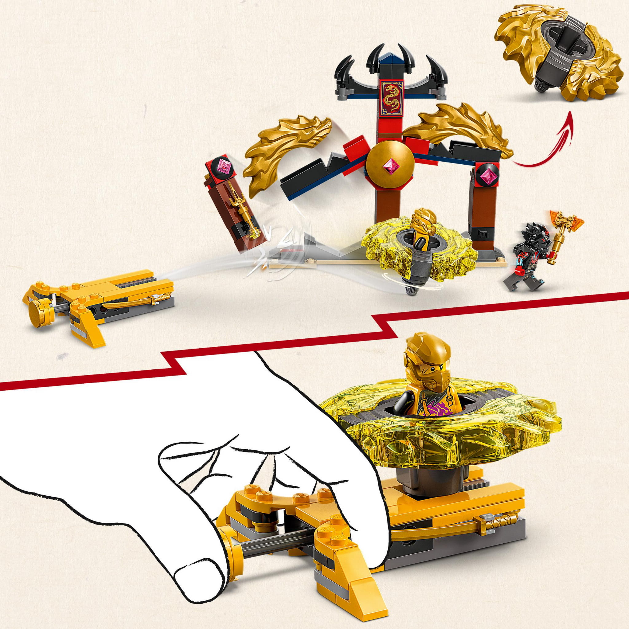 Ten mały zestaw LEGO® zawiera świątynię areny, dwie minifigurki Arinai Rasa oraz dwa smocze spinnery Spinjitzu, które dzieci mogą umieścić w wyrzutniach i wystrzelić je, by ze sobą walczyły.