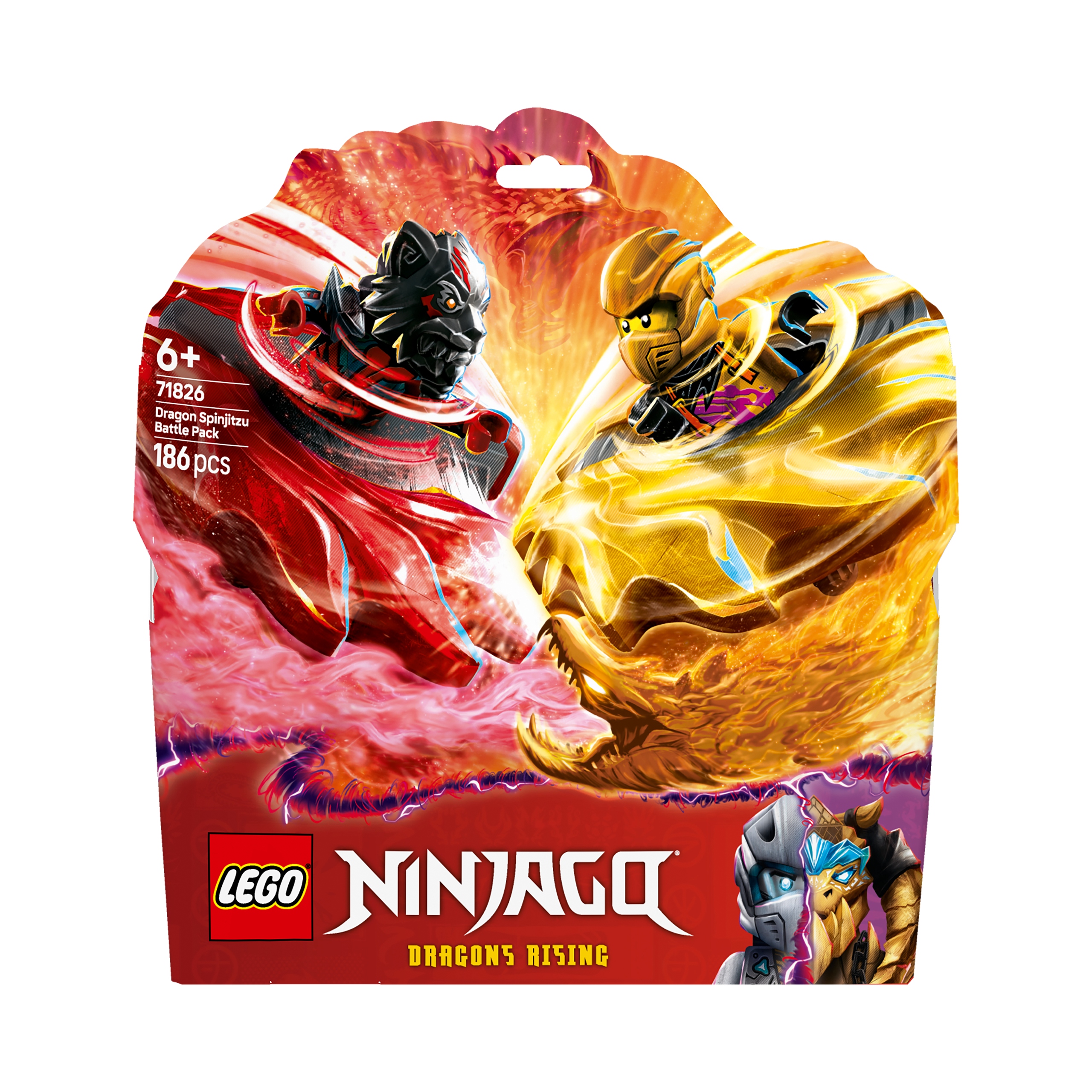 Zestaw Smocze Spinjitzu — zestaw bitewny (71826) umożliwia sześciolatkom i starszym dzieciom odgrywanie niesamowitych akcji z trzeciego sezonu serialu NINJAGO® Powstanie Smoków.