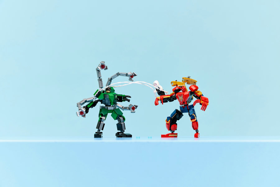 Dzieci mogą ustawiać dwa mechy w różnych pozach, aby odgrywać ciekawe przygody wraz z minifigurkami LEGO® ǀ Marvel: Spider-Mana, Ghost-Spidera i Doc Ocka. Oba mechy są w pełni ruchome, co pozwala na maksymalną dynamikę akcji. Każdy ma otwierany kokpit, w którym mieści się minifigurka pilota. Mech Spider-Mana ma wygląd Iron Spidera i dwa ruchome miotacze klocków uruchamiane przyciskiem. Mech Doc Ocka jest natomiast wyposażony w cztery w pełni ruchome macki. W zestawie znajdują się również dwie pajęcze liny, które można z łatwością przymocować do mechów iminifigurek, a Ghost Spider ma pajęczyny, które można przymocować do tułowia mecha Doc Ocka.