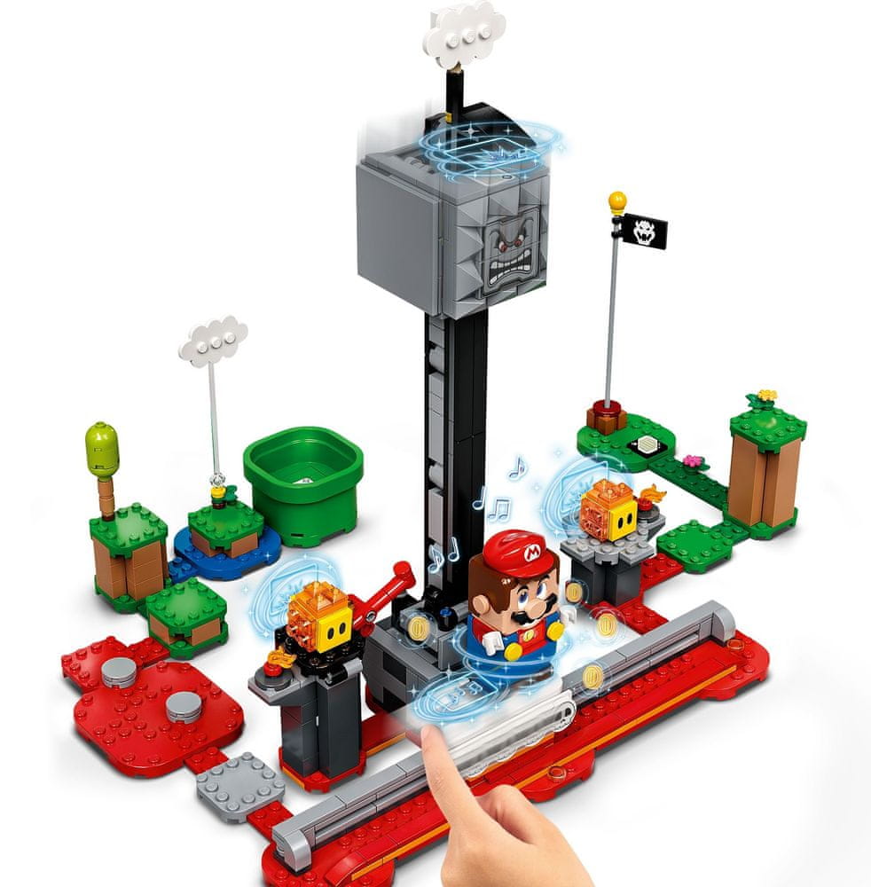 Wzbogać swój zestaw startowy LEGO® Super Mario o nowe przygody, w których będziesz musiał uciec przed Thwompem! Umieść Maria LEGO® (figurka nie jest częścią zestawu) na platformie. Wybierz część z występami lub trudniejszą, gładką powierzchnię. Szybuj z boku na bok, unikaj Thwompa i zdobywaj monety. I uważaj na Lava Bubble!