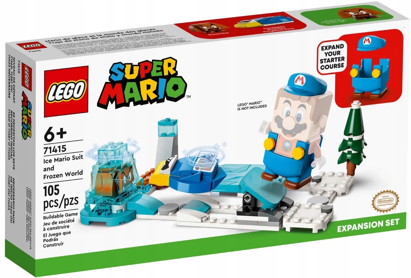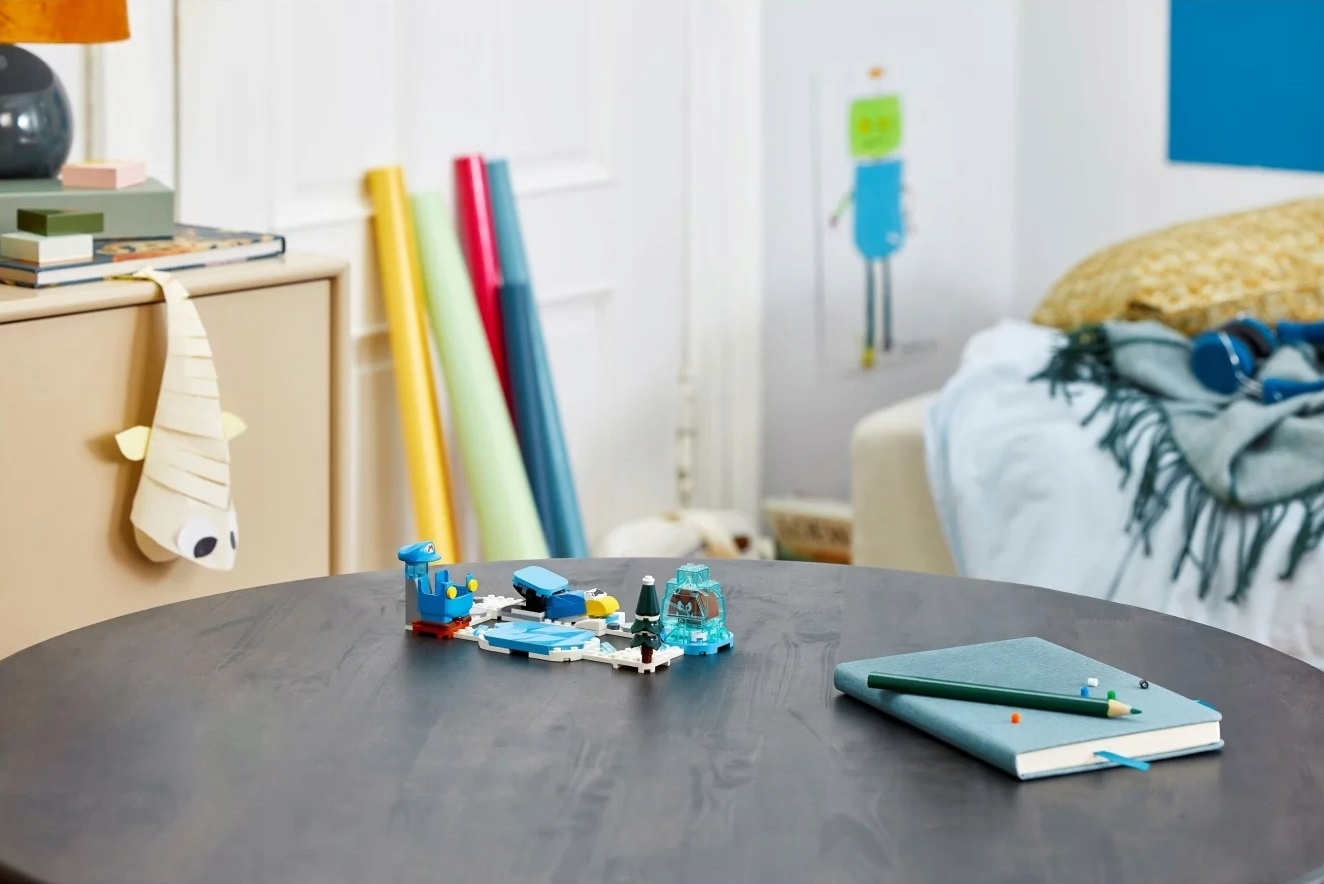 - Wystrzałowa zabawa z Cooliganem – dzięki zestawowi LEGO® Super Mario™ Mario – lodowy strój i kraina lodu – zestaw rozszerzający (71415) dzieci mogą budować fajne lodowe poziomy