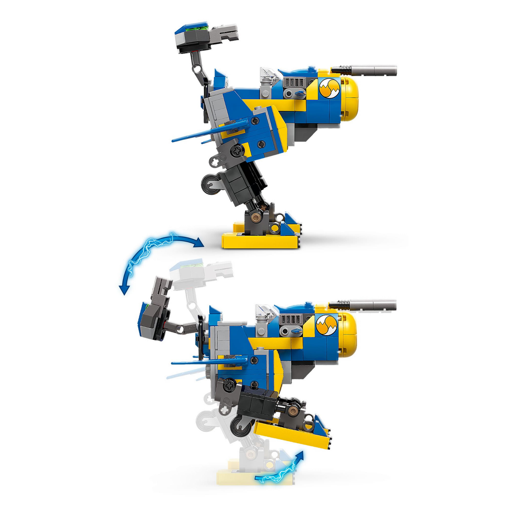 Zabawka z serii LEGO® Sonic the Hedgehog™ zawiera mecha z ruchomymi nogami i wieżyczką z miotaczem klocków. Dzieci mogą przełączyć mecha w tryb latania, składając nogi i obracając je do przodu.