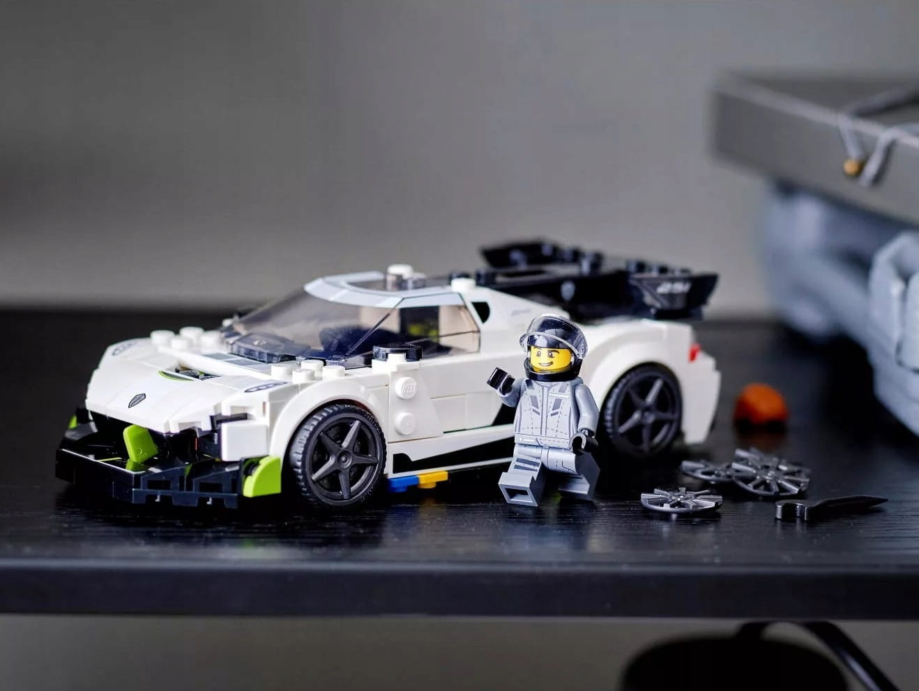 - W pudełku znajdziesz wszystko, czego potrzeba do zbudowania imponującego modelu auta Koenigsegg Jesko, a także kierowcę wyścigowego.