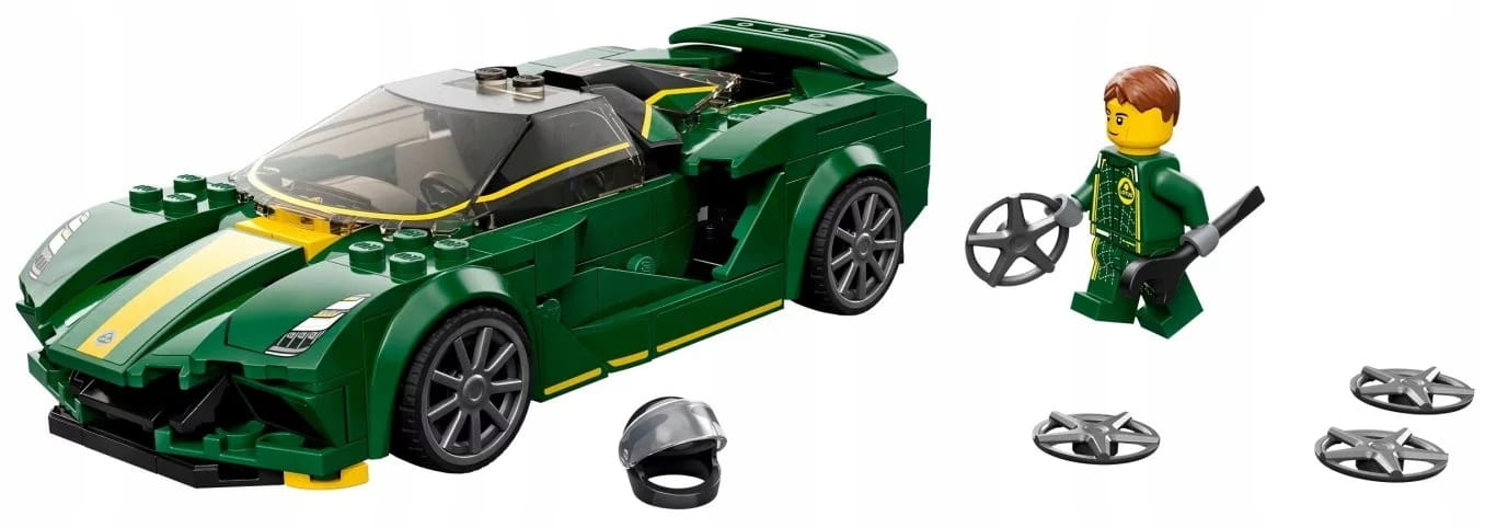- Zawartość opakowania — w środku są wszystkie elementy potrzebne do zbudowania repliki samochodu Lotus Evija oraz minifigurka kierowcy w kombinezonie wyścigowym Lotus z kaskiem, włosami i kluczem