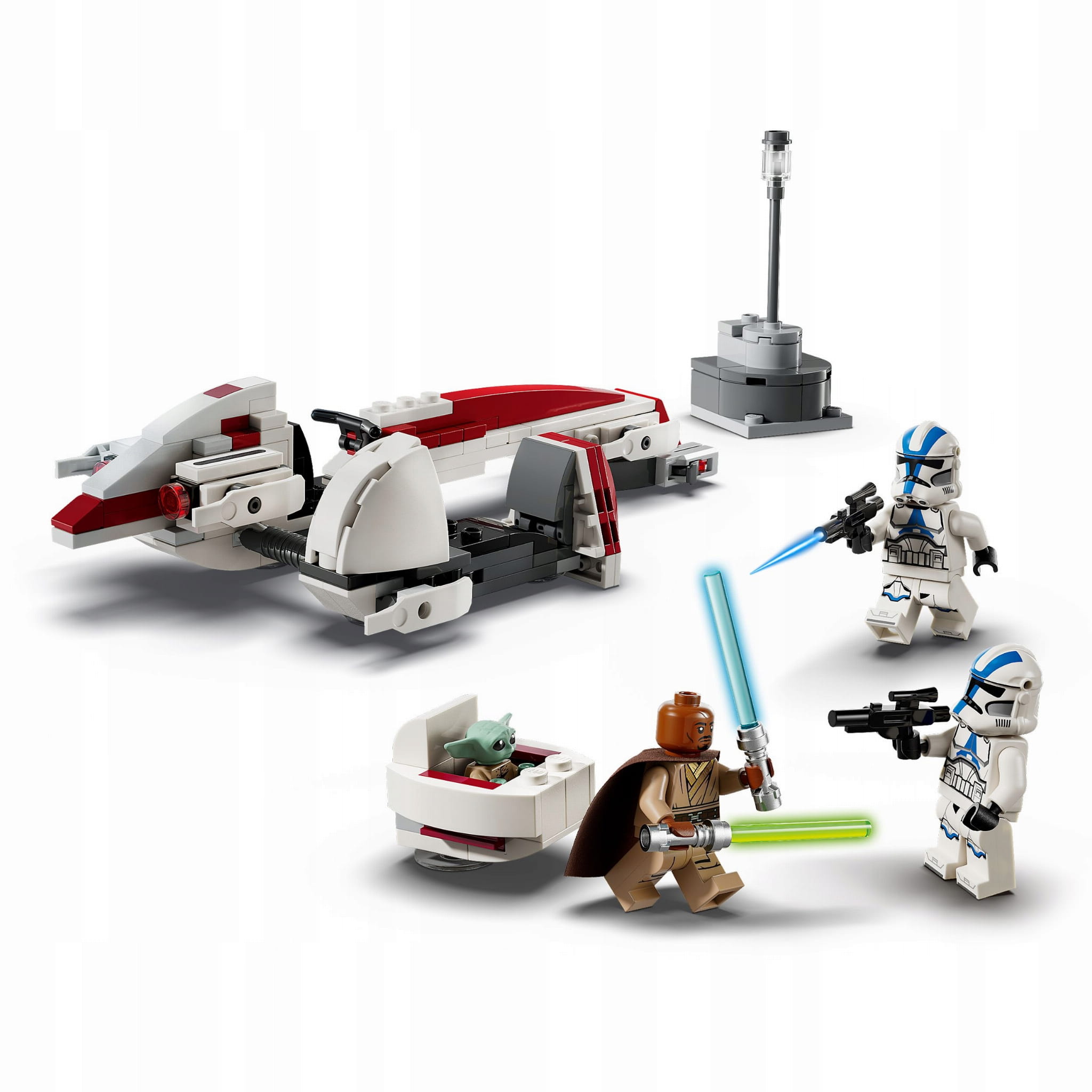Ten zestaw konstrukcyjny zawiera także niewielką scenkę do zbudowania i trzy minifigurki LEGO: Kellerana Beqa z niebieskim i zielonym mieczem świetlnym oraz dwóch żołnierzy-klonów z 501. legionu, każdy z miotaczami, a także figurkę LEGO Grogu (pieszczotliwie zwanego przez fanów Baby Yodą), aby odgrywać pełne akcji przygody.