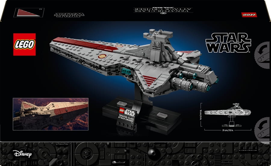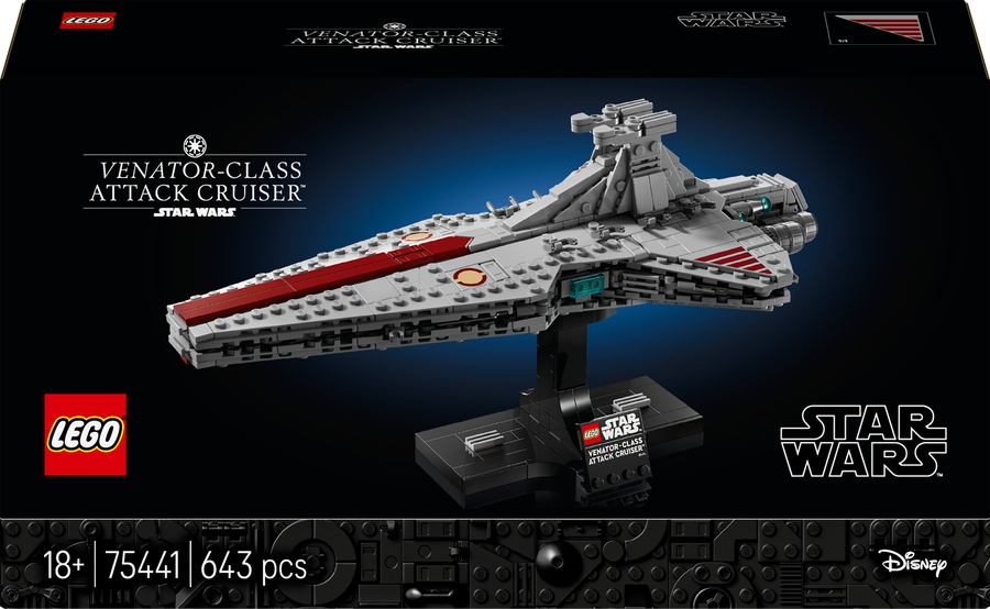 - Autentyczne detale — odtwórz opływowy kształt i charakterystyczne oznaczenia kultowego Krążownika szturmowego typu Venator z klocków LEGO®