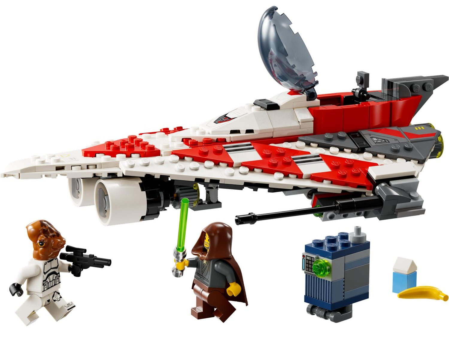 - Myśliwiec rycerza Jedi z Gwiezdnych Wojen™ — zbudowany z klocków LEGO® statek kosmiczny ma otwierany kokpit ze schowkiem, dwa działka sprężynowe, uchwyty na miecze świetlne i chowane podwozie