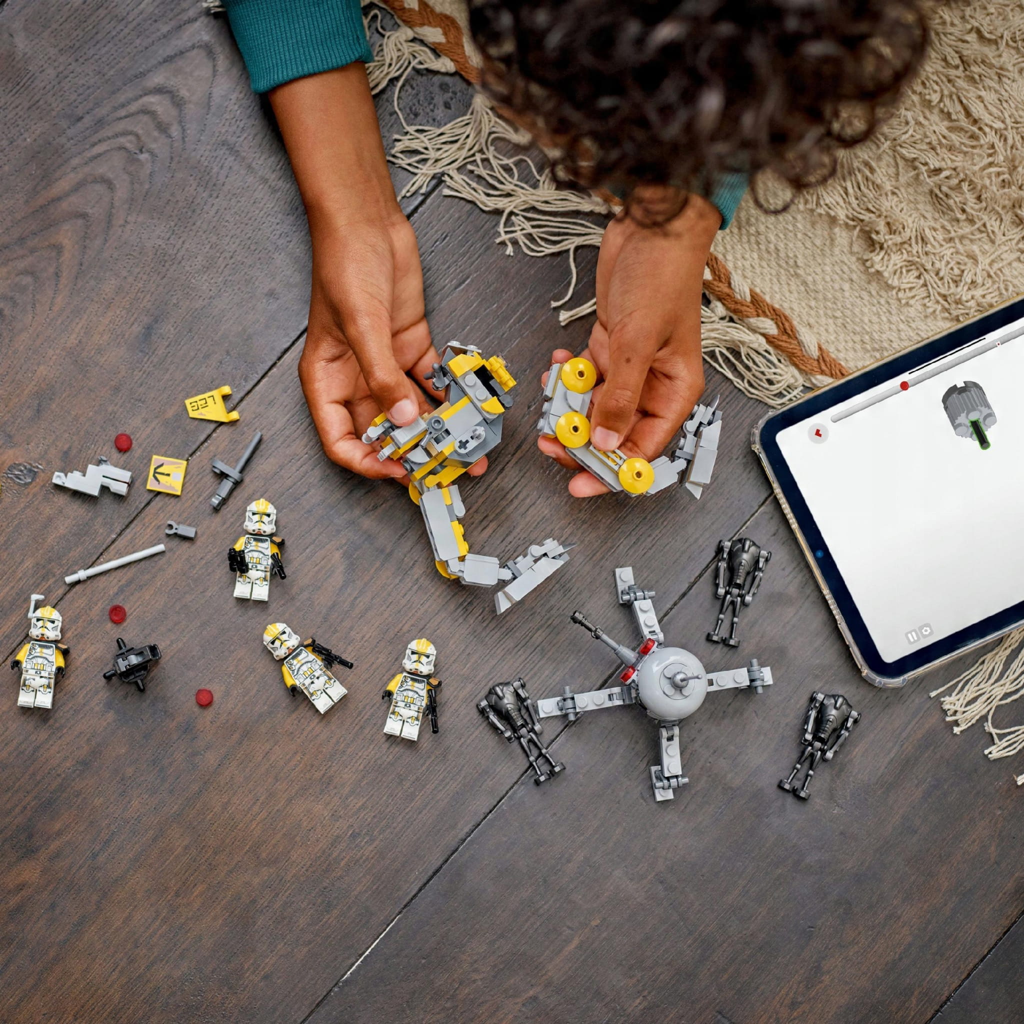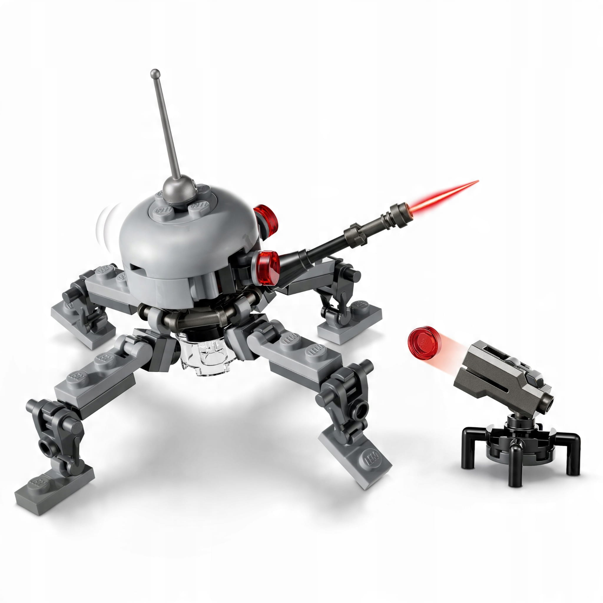 Ten zestaw z Gwiezdnych Wojen zawiera również maszynę kroczącą AT-RT z kokpitem dla minifigurki LEGO, miotacz klocków, schowek na blaster i lornetkę oraz wieżyczkę z miotaczem klocków, a superdroidy bojowe mają droida-pająka do odgrywania epickich bitew.