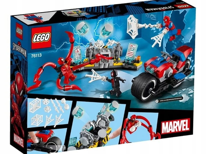 - Motocykl Spider-Mana ma siedzenie dla minifigurki, ruchomą kierownicę, duże koła, miotacz pajączków i pistolet z pajęczyną (niestrzelający), do którego można doczepić klocki przedstawiające pajęczą sieć.