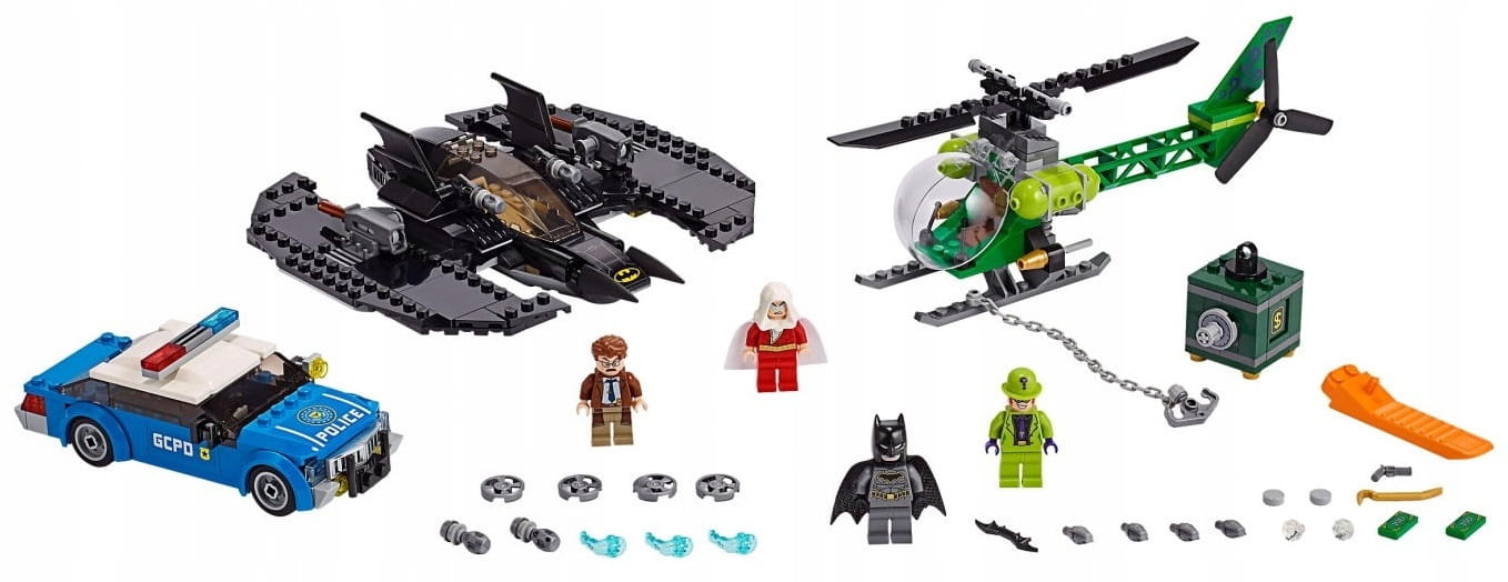 - Helikopter Człowieka-Zagadki ma otwierany kokpit dla minifigurki, obracające się wirniki, dwie wystrzeliwane rakiety i łańcuch z hakiem, za pomocą którego można podnieść sejf.