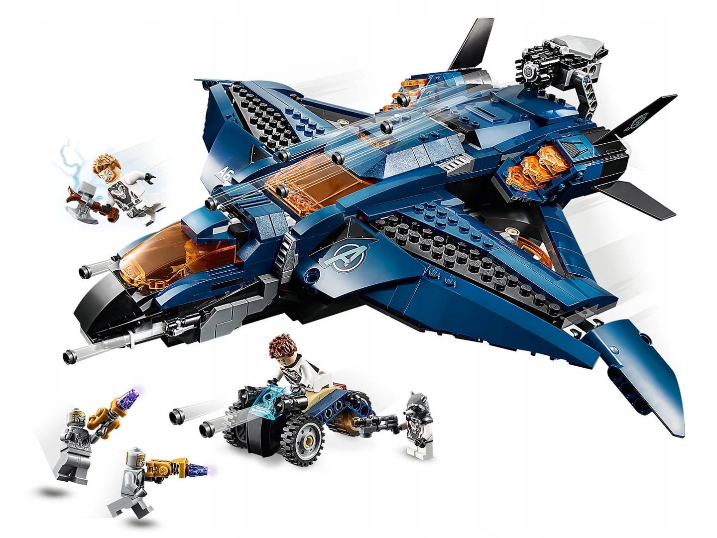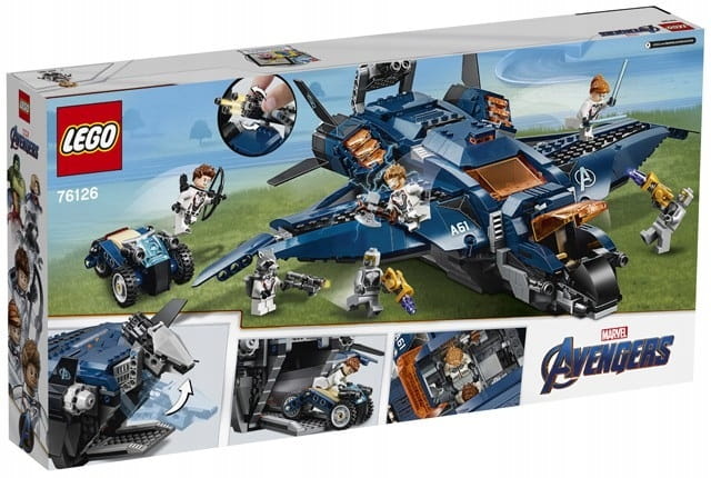 - Wspaniały Quinjet z serii Marvel ma otwierany kokpit z miejscem dla minifigurki, dwa miotacze klocków, ruchome skrzydła, obracające się śmigła, otwieraną kabinę dla pasażerów z dwoma siedzeniami dla minifigurek i stojakami na broń oraz otwierany tylny luk, w którym znajduje się składane szybkostrzelne działko na sześć klocków i motocykl.