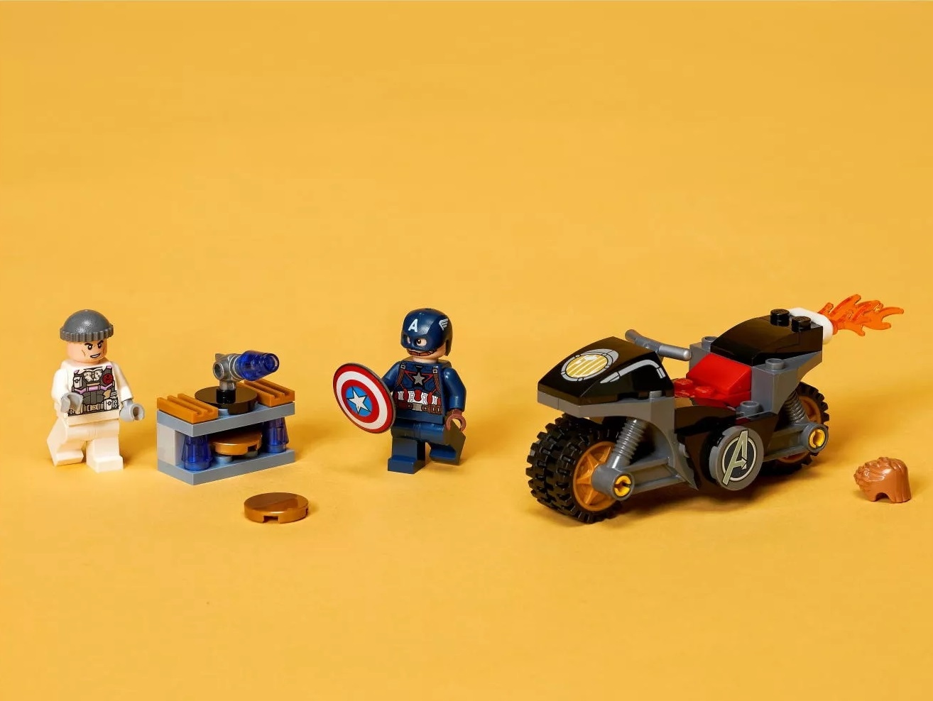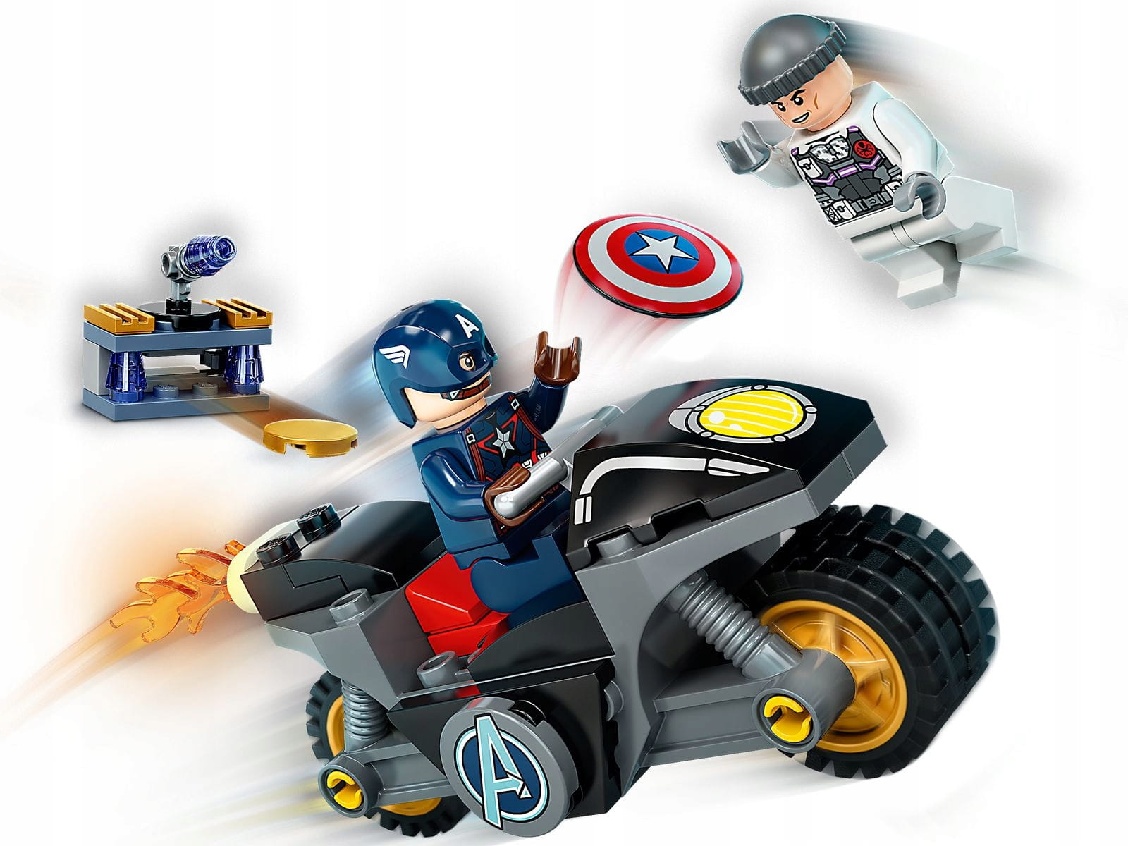 - W komplecie minifigurki Kapitana Ameryki i agenta Hydry, motocykl do zbudowania oraz miotacz dysków z odczepianym blasterem.