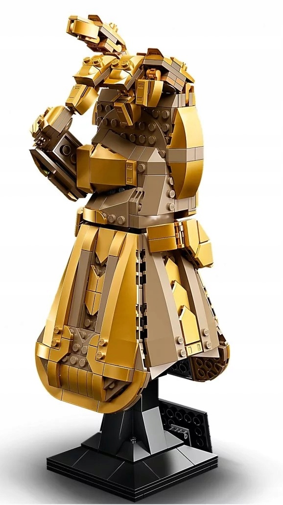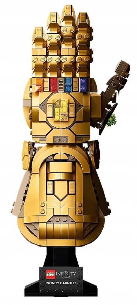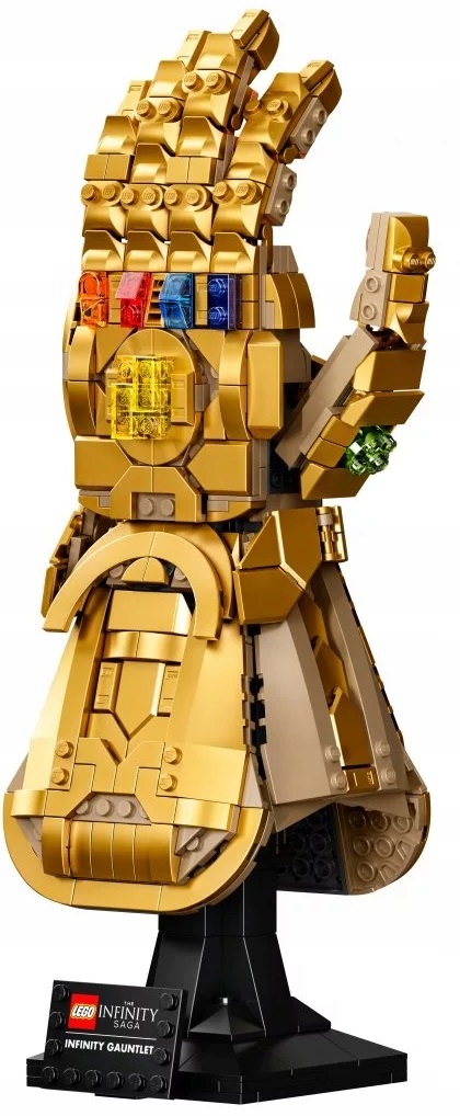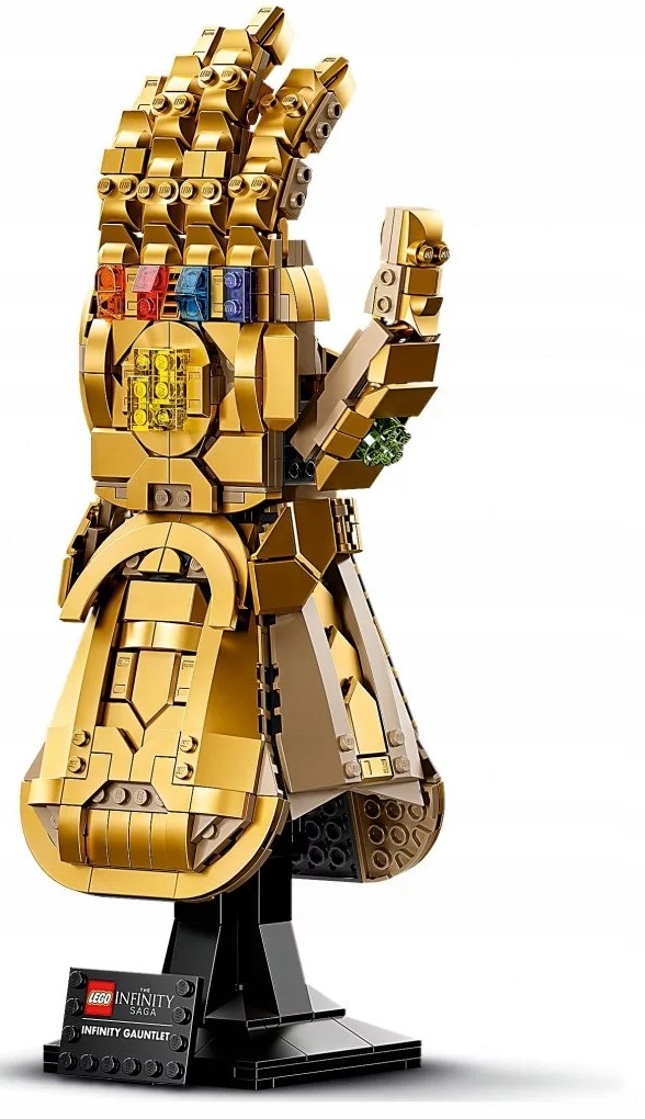 - Realistycznie wyglądająca, złota Rękawica Nieskończoności z klocków LEGO® zawiera kolorowe Kamienie Nieskończoności i solidną podstawkę z tabliczką z opisem.