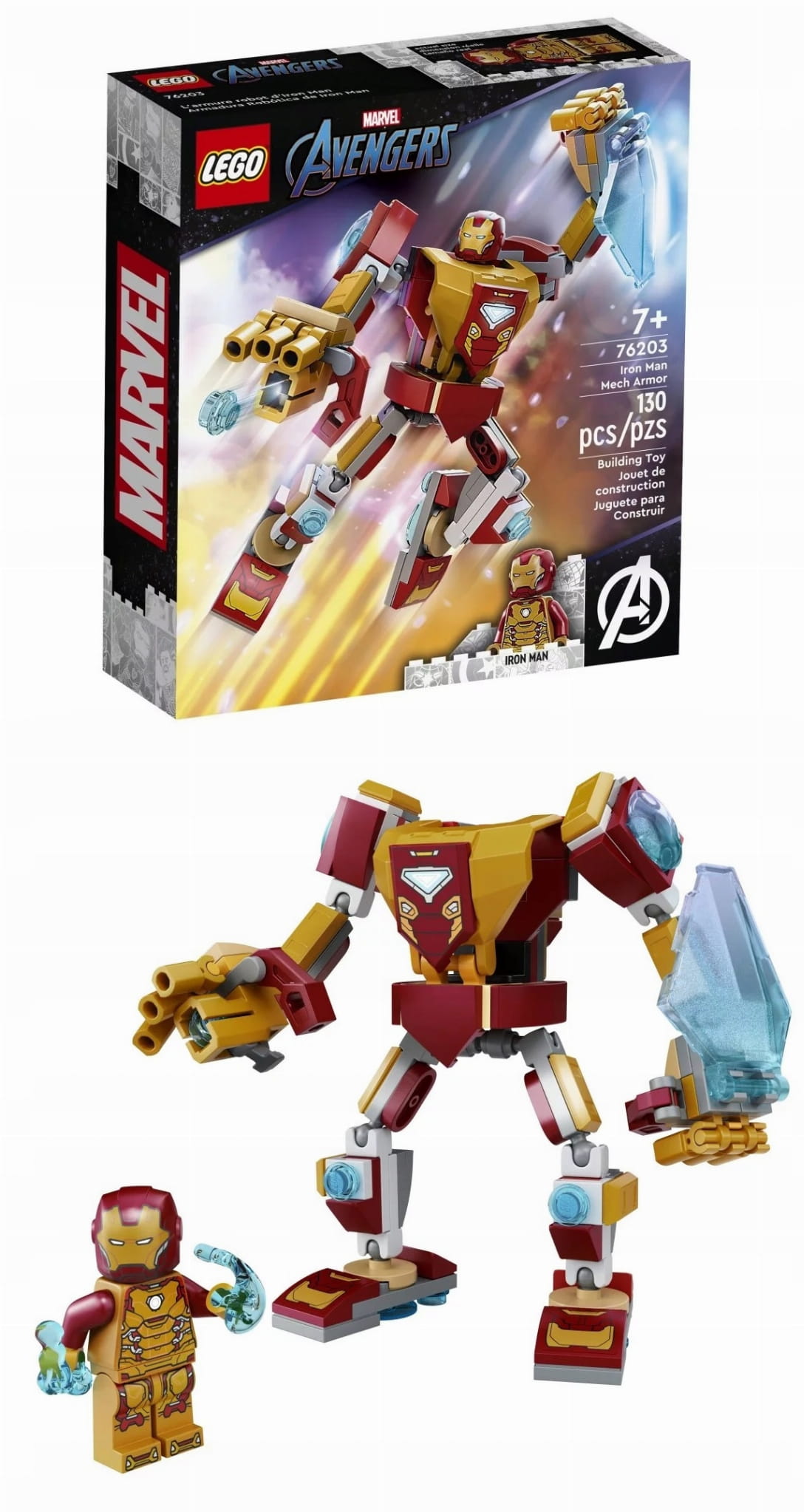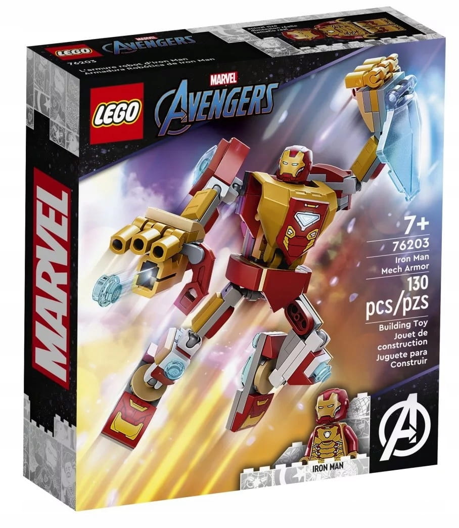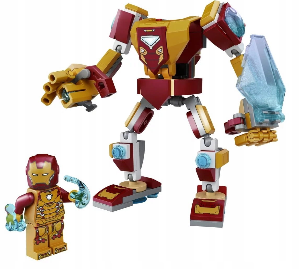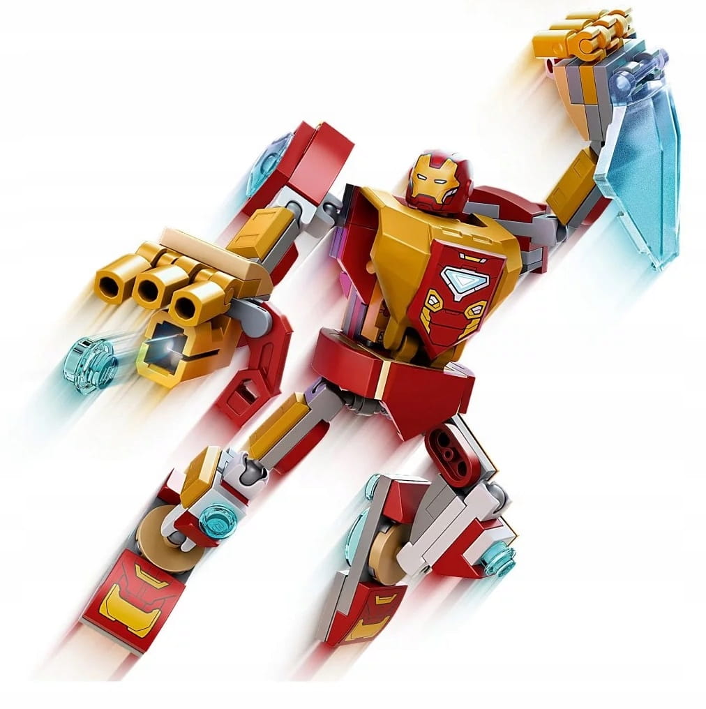 - Popularna postać Marvela — w komplecie minifigurka Iron Mana i złożony z klocków mech Iron Mana z naładowanym miotaczem klocków, dużą tarczą energetyczną i w pełni ruchomymi rękami i nogami