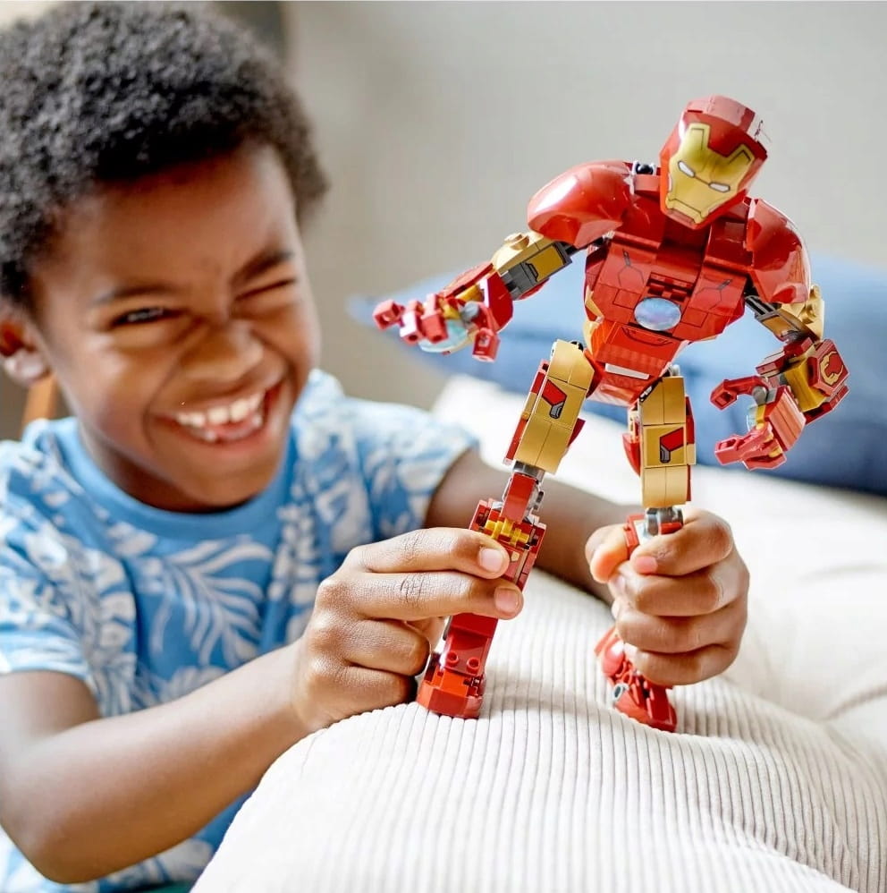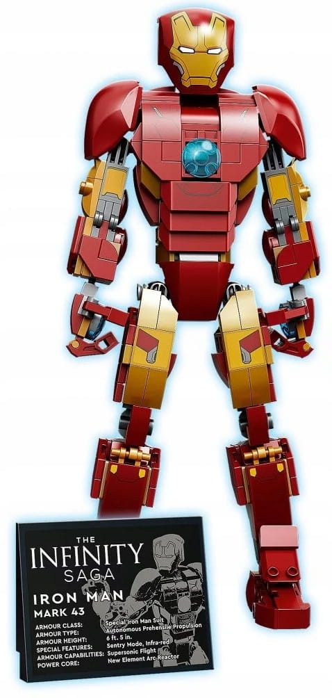 - Całkowicie ruchomy — wszystkie części złożonego z klocków Iron Mana mają przeguby, więc dzieci mogą ustawiać zbroję w realistycznych pozach