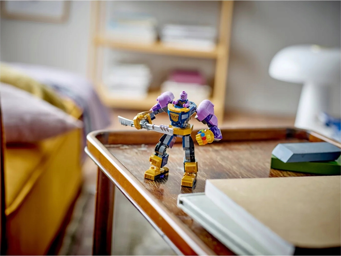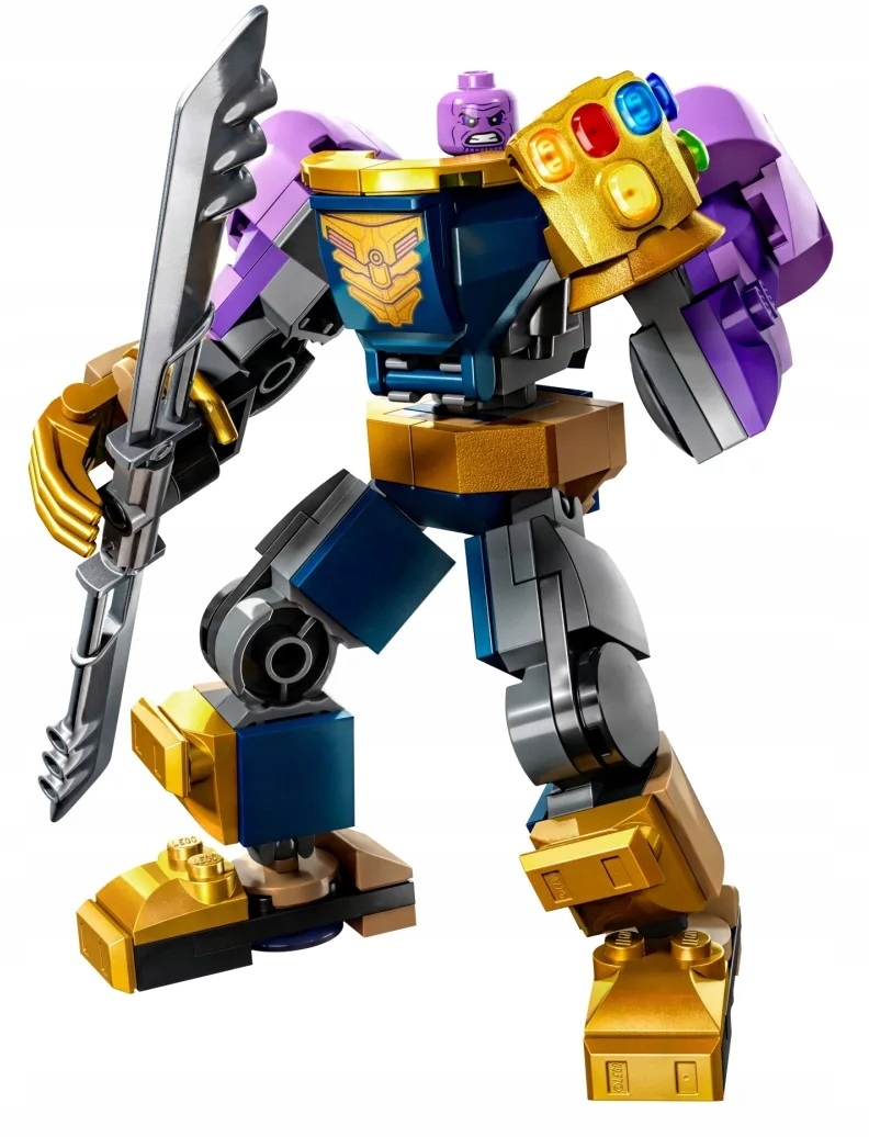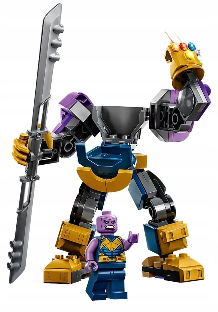 Minifigurka LEGO Thanosa pasuje do otwieranego kokpitu mecha. W pełni ruchome ręce, nogi i palce można ustawiać w różnych pozach, co urozmaica zabawę i ułatwia ustawianie modelu na półce. Słynny miecz obosieczny, Rękawica Nieskończoności i Kamienie Nieskończoności zawarte w zestawie zapewnią wiele godzin zabawy.
