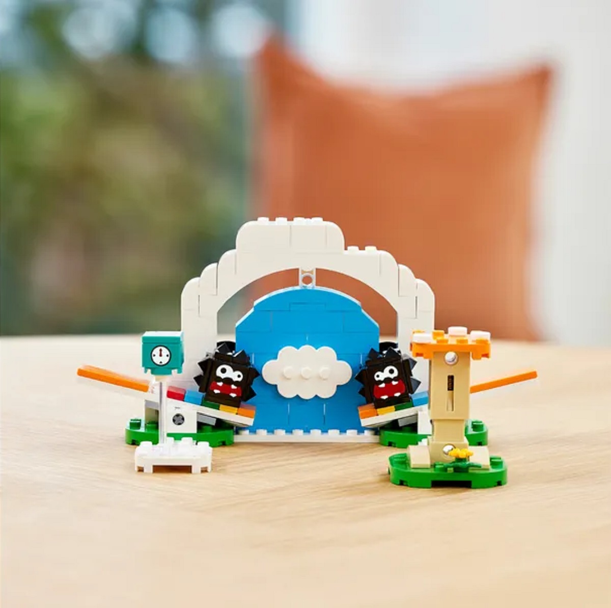 - Dwie figurki LEGO® Fuzzych — pomóż LEGO® Mario™, LEGO® Luigiemu™ lub LEGO® Peach™ (uwaga: te trzy interaktywne figurki nie są częścią zestawu) nadepnąć na obie platformy i strącić z nich Fuzzych, aby ich pokonać