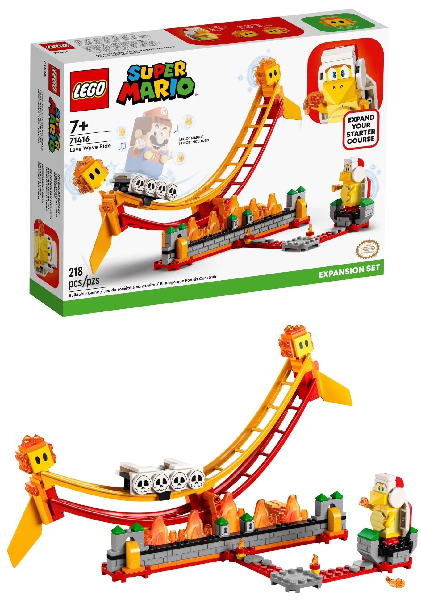 - Ujeżdżaj lawowe fale (71416) – dzięki temu zestawowi rozszerzającemu z obrotową falą lawy i przeciwnikami Super Mario™ dzieci mogą dodać lawowy poziom do swojego świata LEGO® Super Mario™