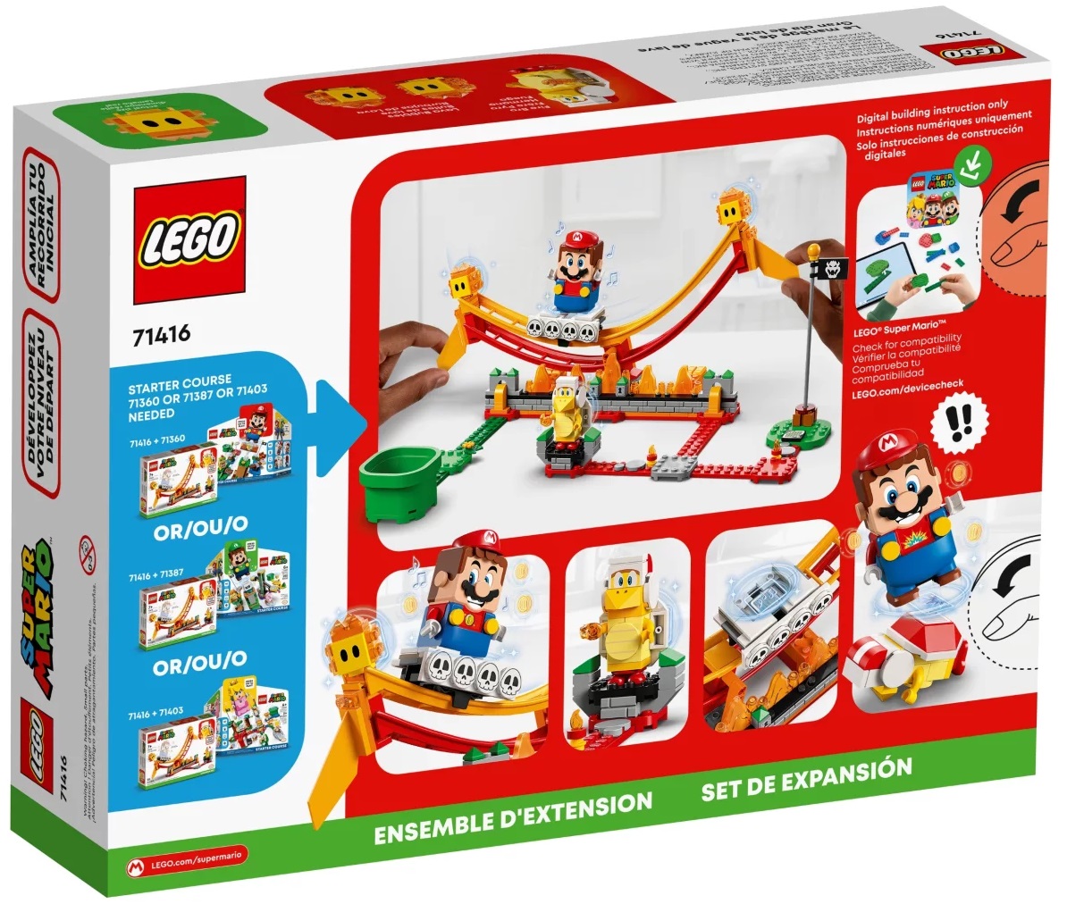 Dzięki zestawowi Przejażdżka po fali lawy – zestaw rozszerzający (71416) młodzi budowniczy mogą stworzyć lawowy poziom w świecie LEGO® Mario™.