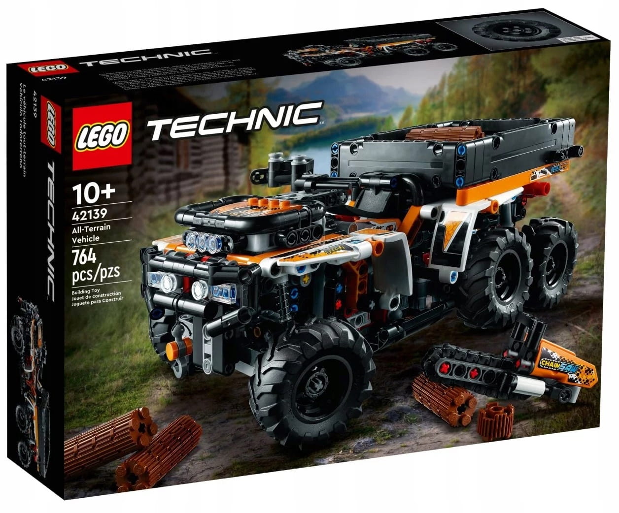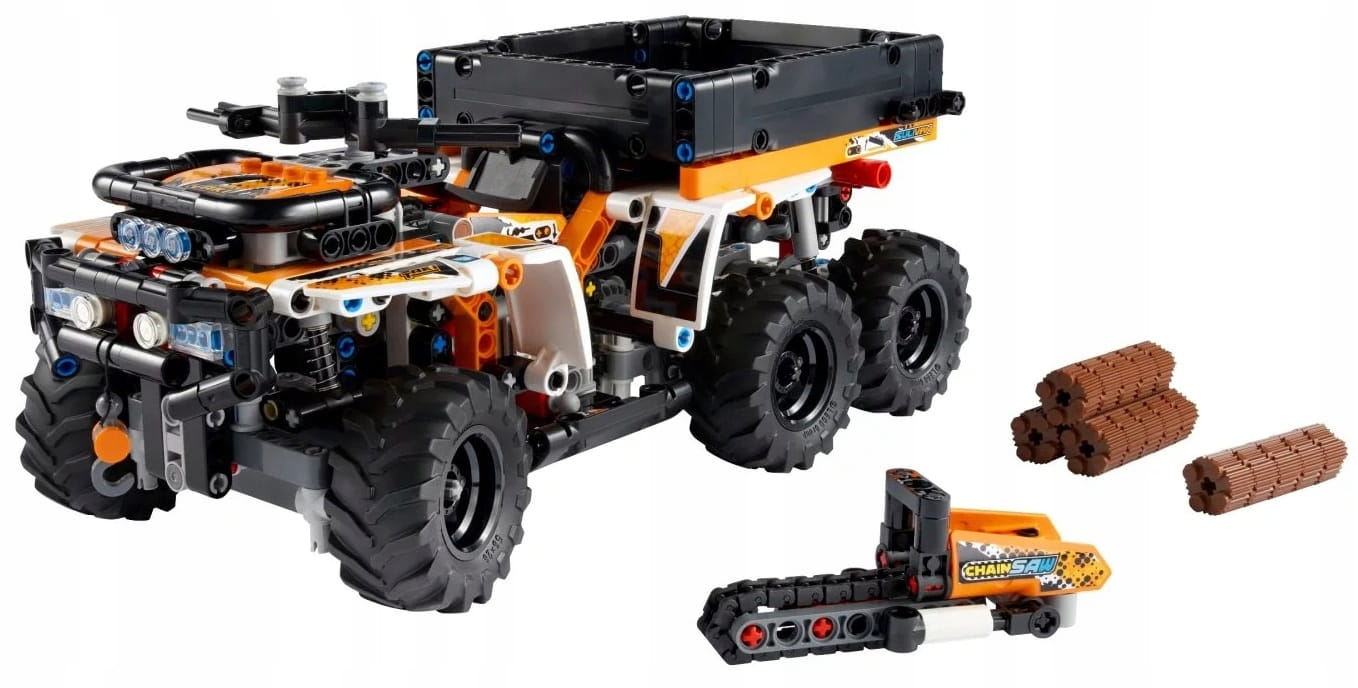 - Terenowe akcesoria — do tego zestawu konstrukcyjnego dołączona jest piła łańcuchowa oraz 20 małych fragmentów belek, z których można złożyć duże belki do przetransportowania pojazdem