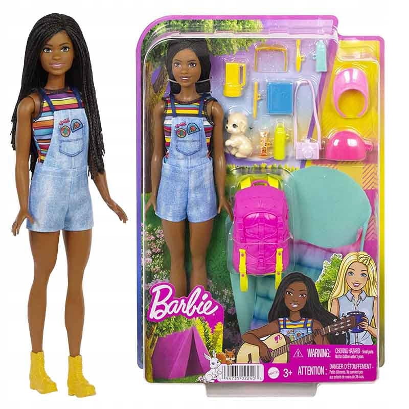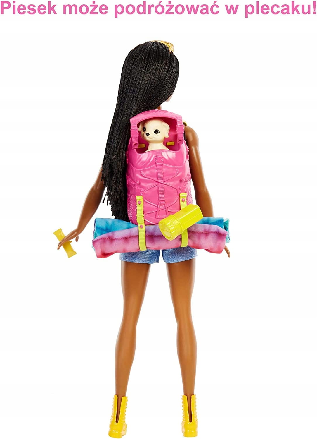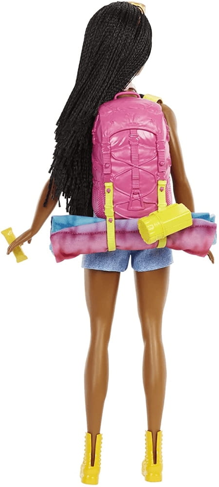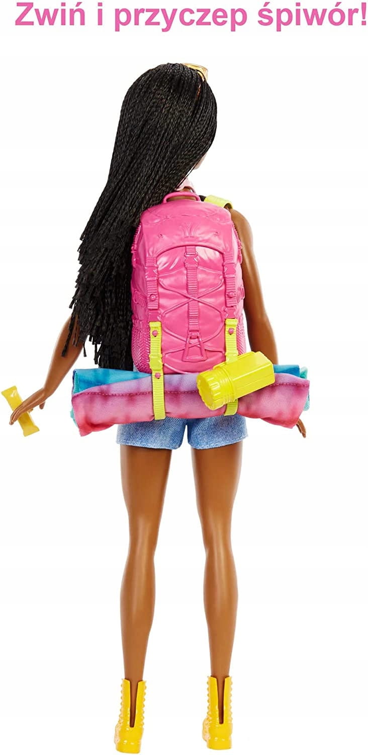 Lalka Barbie „Brooklyn” Roberts jest gotowa na przygody na świeżym powietrzu – ma koszulkę w paski i dżinsowe ogrodniczki, a dodatkowo plecak i świetne akcesoria kempingowe.