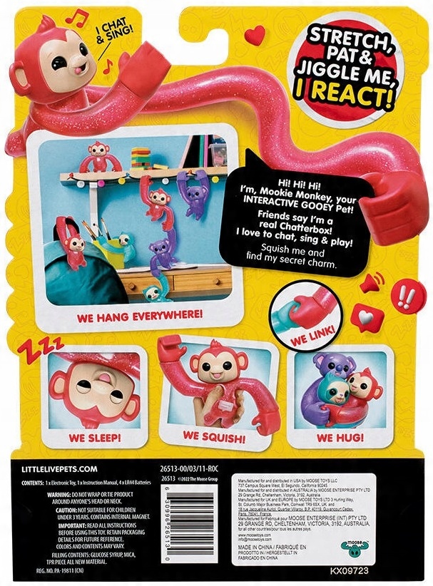 INTERAKTYWNY ZWIERZAK: Little Live Pets - Hug n' Hang Zoogooz Mooki Monkey to miękki i elastyczny towarzysz dla dzieci, oferujący ponad 70+ dźwięków i reakcji, które zapewniają ekscytującą zabawę i czułość. Dzieci mogą rozmawiać, śpiewać, śmiać się i karmić swojego Mooki Monkey'a, co pozwala na różnorodne interakcje i odkrywanie zabawnych odpowiedzi.