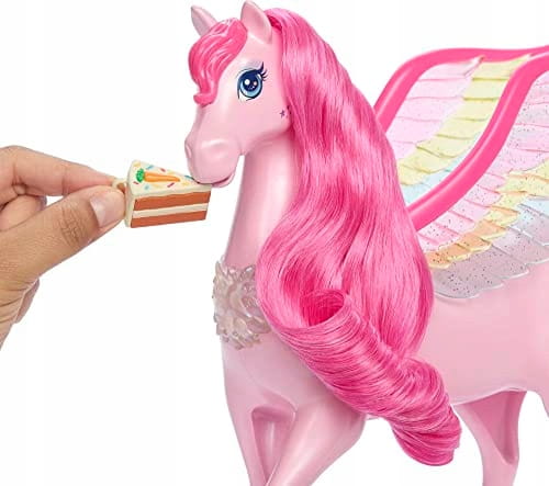 Barbie Pegaz ma jaskraworóżową grzywę i ogon, a także błyszczące, tęczowe skrzydła! Jej pokazy świetlne i dźwiękowe aktywowane są na trzy różne sposoby. Dzieci mogą nacisnąć jej naszyjnik lub poruszyć skrzydłami, aby zobaczyć tęczowe światła i usłyszeć magiczne dźwięki, w tym piosenkę przewodnią Barbie: Dotyk magii.