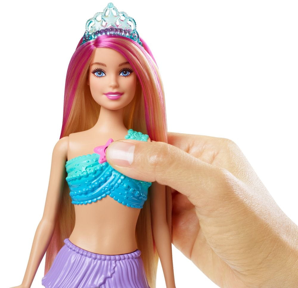 Lalka Barbie™ Dreamtopia Syrenka™ pluska się w wannie lub basenie, ale dzieci mogą też zabrać zabawę na brzeg — naciśnij przycisk w kształcie gwiazdy na gorsecie lalki Barbie®, aby cieszyć się pokazem świetlnym bez wody.