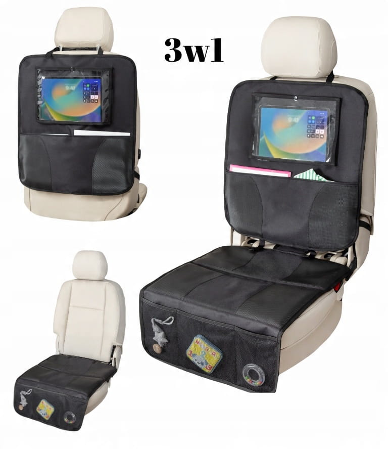 - Mata 3w1 - możliwość rozpięcia i wykorzystania jako mata na siedzisko i organizer na oparcie samochodu.